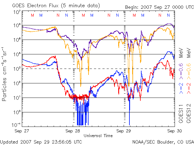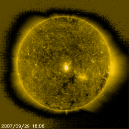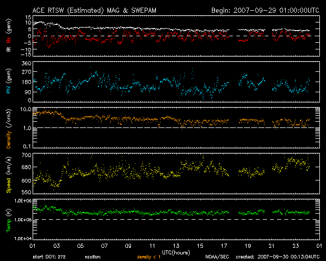 2007/ 9/30 09:14 更新 600km/秒台のかなり高速の太陽風が続いています。オーロラも活発です。 担当 篠原 地球は高速太陽風のまっただ中にいます。 昨日より、600〜650km/秒と太陽風はたいへん高い速度で安定しています。 磁場強度も、5nTとやや下がったもののまだ弱まりきってはおらず、 しかも南北に細かく変動しています。 そのため、活発なオーロラ活動を引き起こしています。 AE指数では、500〜1000nTの中規模活動が一日を通して観測されています。 その様子はシベリアの磁場データでも明らかで、 昨日のグラフ(右側3分の1)は、この3日間で最も激しく変動しています。 太陽風は今日いっぱいは現在の高まった状態を保つでしょう。 アラスカのライブカメラでオーロラを観望するチャンスが続いています。 しかし、明日くらいからは、高速風は次第に弱まって来ると思います。 まず、太陽風の磁場強度が5nTを割って、3nTくらいに弱まります。 そして、速度も次第に低下を始めるのです。 磁気圏のオーロラ活動も次第に弱まって来るでしょう。 放射線帯の高エネルギー電子が、大きく増加しています。 GOES11(青線)で、一気に警戒レベル(10,000の線)を超えています。 GOES12(赤線)はまだですが、こちらも続いて超えて来るでしょう。 しばらく衛星では障害の発生しやすい状況が続きますので、注意が必要です。 太陽では、ちょうどまん中に971黒点群が見えています。 小さな黒点群で、フレア活動は現在も穏やかです。 SOHO衛星のEIT284カメラの映像 (c) SOHO (ESA & NASA)