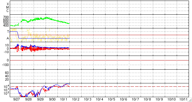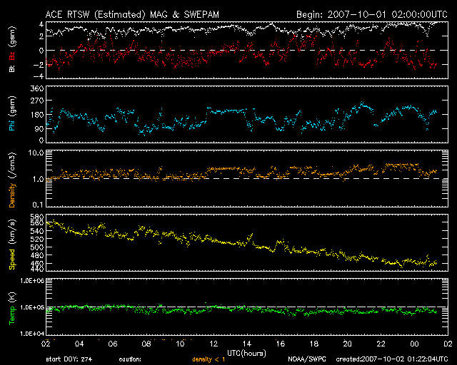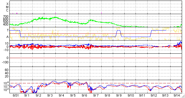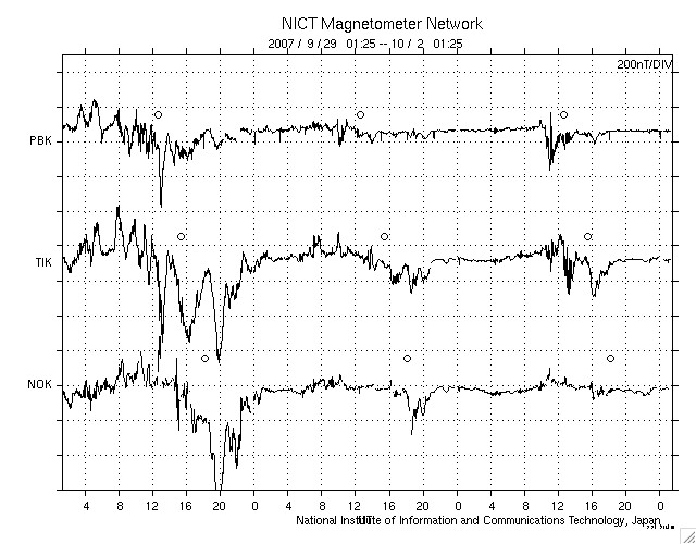 ACEが観測した太陽風の磁場(1番上の枠、白線は全体の強度、赤線は南北成分) および、太陽風の密度(3番目の橙線)、速度(4番目の黄線) (c) NOAA/SEC ![]() シベリアで観測された3日間の磁場データ 右側の3分の1が、昨日のデータになります。グラフが上がったり下がったりすると、オーロラ活動が活発化しています。 (c) NICT ![]() 27日の太陽周期に合わせたデータプロット 太陽が同じ面を地球に向けていた27日前の変化から、今後を予想することができます。 (c) NICT