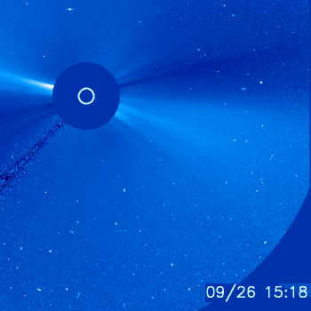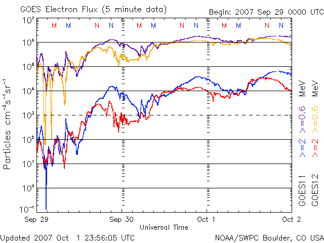 2007/10/ 2 10:23 更新 太陽風の速度は下がり、穏やかになってきました。放射線帯高エネルギー電子が大きく増加しています。 担当 篠原 1週間ほど前のことになりますが、 SOHOのLASCO C3カメラで、小さな彗星が太陽に接近して行く様子が見えました。 宇宙天気ではありませんが、その様子を紹介します。 太陽の近くでやっと明るくなる小型彗星の姿は、SOHOのコロナグラフならではです。 太陽風の速度は引き続き低下して、現在450km/秒になりました。 地球は高速風領域を抜け出し、穏やかな太陽風の領域に入っています。 磁場強度は3-4nTとやや弱めで、こちらも穏やかです。 ただ、昨日までは太陽風も500km/秒台を保っていましたので、 小規模のオーロラ活動が見られました。 シベリアの磁場データでは、PBKとTIKで変動が見えています。 NOKが静かなのは、オーロラが発生した時の観測点の地方時の関係です。 このまま、今日一日は太陽風も穏やかなままでしょう。 しかし、明日くらいに、短期間の太陽風の乱れがやって来るかもしれません。 27日周期の図で、9月6-7日に見えている速度の山です。 発生源のコロナホールは、SOHO EIT284の太陽の右寄りに見えています。 大きな乱れになることはありませんが、一時的にオーロラが活発化するかもしれません。 そして、その乱れの通過後は、10日くらいにわたって、 とても穏やかな日が続くと思われます。 放射線帯の高エネルギー電子は、更に増加して、かなり高いレベルに達しています。 GOES11、12の両衛星で、10,000を大きく超えています。 衛星の運用では支障が発生しやすくなっています。 しばらくのあいだ注意が必要でしょう。 971黒点群は、掲載の写真ではほとんど見えなくなっています。 規模はかなり小さくなっているようです。 フレア活動はたいへん静かです。 SOHO衛星LASCO C3カメラが観測した、太陽に接近する小さな彗星。世界時9月26日15時〜27日22時。 (c) ESA & NASA, 宇宙天気ニュース ![]() SOHO衛星のEIT284カメラの映像 (c) SOHO (ESA & NASA)