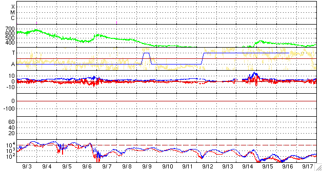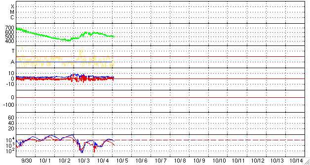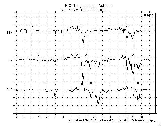 ACEが観測した太陽風の磁場(1番上の枠、白線は全体の強度、赤線は南北成分) および、太陽風の密度(3番目の橙線)、速度(4番目の黄線) (c) NOAA/SEC ![]() リアルタイムAE指数 下段のAEグラフの値が高くなると、オーロラ活動が活発化しています。 (c) 京都大学, NICT ![]() シベリアで観測された3日間の磁場データ 右側の3分の1が、昨日のデータになります。グラフが上がったり下がったりすると、オーロラ活動が活発化しています。 (c) NICT ![]() 27日の太陽周期に合わせたデータプロット 太陽が同じ面を地球に向けていた27日前の変化から、今後を予想することができます。 (c) NICT