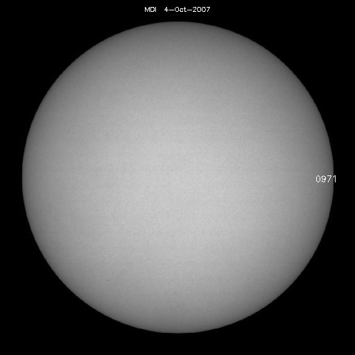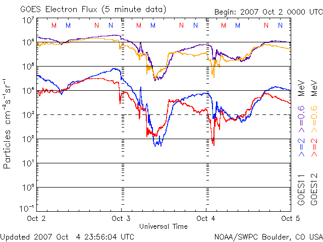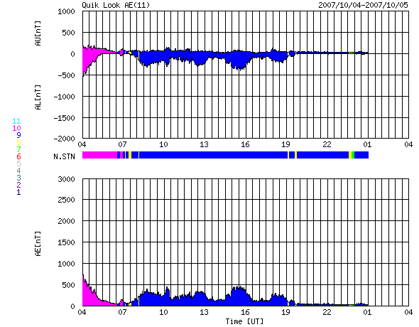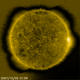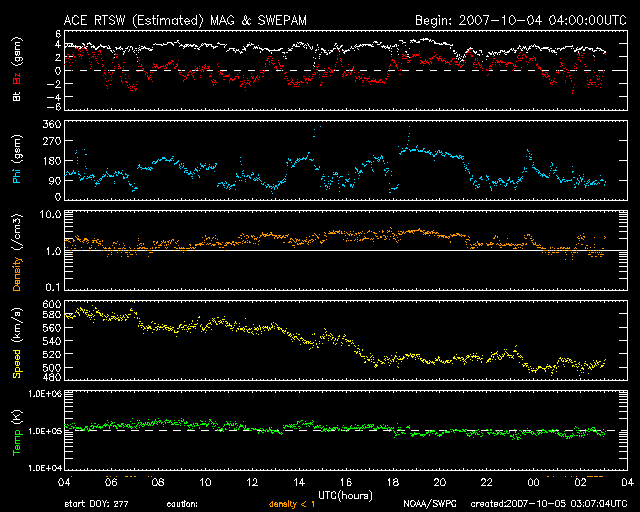 2007/10/ 5 12:06 更新 太陽風の速度が下がり始め、高速風帯は終わりを迎えています。 担当 篠原 ース以降、太陽風の速度はゆっくりと下がり、 現在は、500km/秒と普通の高速風くらいになっています。 磁場強度も3nTと弱まったままで、高速風は終盤を迎えています。 このまま速度は下がり続け、地球は明日には高速風領域を抜け出しているでしょう。 速度が高かったことと、-2nT程度と強度は弱かったものの磁場が南を向いていた影響で、 中小規模のオーロラ活動が発生していました。 AE指数では、最初に700nT、中ほどで400nTの変化が見えています。 次第に規模が下がっているのも興味深い変化です。 このように、AEの図の後半で変化がなくなっているのは、 太陽風磁場が北寄りに変わってしまったためです。 これはオーロラ発生器のスイッチが切れてしまったようなもので、 こうなると、速度が高くてもオーロラは弱くなってしまいます。 今日いっぱいは、速度がやや高めの状態にありますので、 小規模のオーロラ活動が見られそうです。 明日以降は、太陽風が穏やかになるので、磁気圏も静穏になります。 放射線帯高エネルギー電子は、ややもどして、10,000のラインを再び超えています。 これ以上の増加はないでしょう。 これから、ゆっくりと低下していきます。 太陽は黒点は見られません。 とても静かな状態です。 SOHO衛星のEIT284カメラの映像 (c) SOHO (ESA & NASA)
