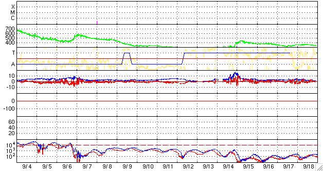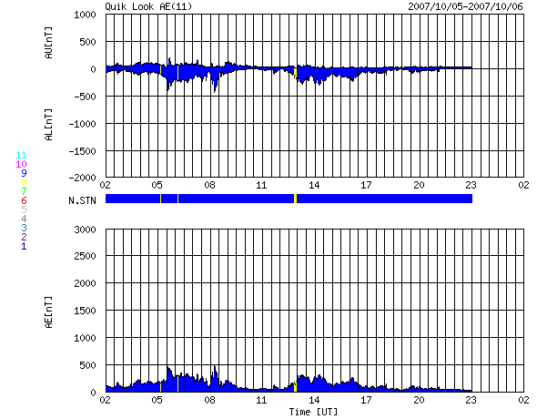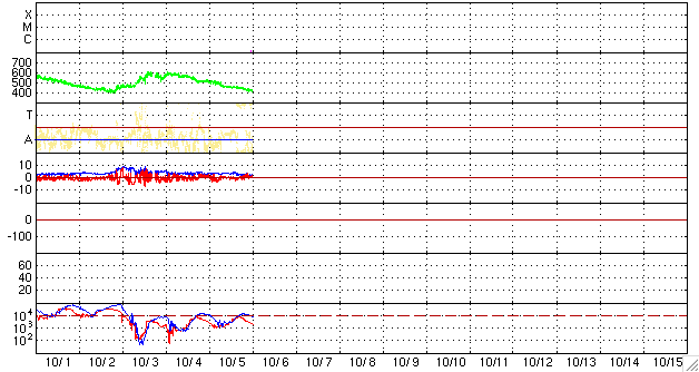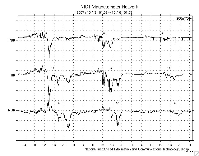 ACEが観測した太陽風の磁場(1番上の枠、白線は全体の強度、赤線は南北成分) および、太陽風の密度(3番目の橙線)、速度(4番目の黄線) (c) NOAA/SWPC ![]() リアルタイムAE指数 下段のAEグラフの値が高くなると、オーロラ活動が活発化しています。 (c) 京都大学, NICT ![]() シベリアで観測された3日間の磁場データ 右側の3分の1が、昨日のデータになります。グラフが上がったり下がったりすると、オーロラ活動が活発化しています。 (c) NICT ![]() 27日の太陽周期に合わせたデータプロット 太陽が同じ面を地球に向けていた27日前の変化から、今後を予想することができます。 (c) NICT