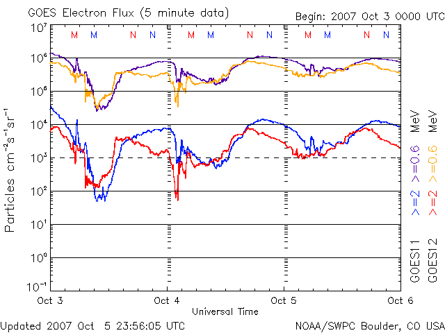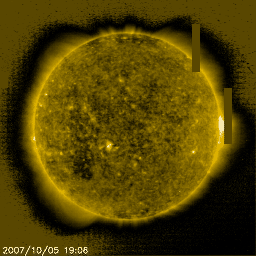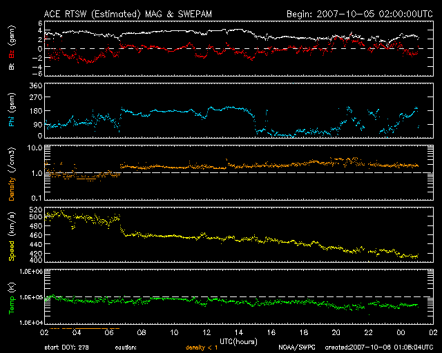 2007/10/ 6 10:09 更新 太陽風は通常の速度に戻りました。これから穏やかな日が続きます。 担当 篠原 太陽風はどんどん速度が下がって、420km/秒と通常の速度に戻りました。 磁場強度も3nT前後で弱まったままです。 極域では、小規模のオーロラ活動が続いていました。 AE指数では300nTくらいの変化が、比較的長い時間続いています。 ただ、活動自体は日を追う毎に小さくなっていて、 シベリアの磁場データを見るとその様子がよく分かります。 現在の太陽風はすっかり落ち着いたので、 今後のオーロラ活動は一段と静かになるでしょう。 そして、これから10日間くらいにわたって、穏やかな宇宙天気が続きそうです。 27日周期の図の、前周期の太陽風速度(緑色線)を見てください。 9月9日から右端の9月17日まで、ずっと速度の遅い状態が続いています。 9月15日に小さな山が見えますが、低速風から普段の速度に戻った様な変化で、 たいした乱れではありません。 低速風はこのあと、9月20日まで続くのです。 これを今周期に当てはめると、今日から約10日間、 10月17日くらいまで穏やかな太陽風が続きそうです。 9月15日の乱れに対応する小規模の乱れは、10月12日くらいにやって来そうです。 SOHO EIT284の太陽コロナ写真の南東(左下)に、 ぼんやりして分かりにくいですが、コロナホールが見えています。 これが、その太陽風の乱れの発生源です。 位置や規模は前周期とだいたい同じで、 吹き出して来る太陽風も同じくらいになりそうです。 来週の後半まで、のんびりと待っていてください。 放射線帯の高エネルギー電子は、 青線のGOES11が10,000のレベルを超えていて、やや高めの状態です。 太陽風が落ち着いたので、これからはゆっくりと減少して行きます。 2〜3日くらいかけて10,000のレベルを割ることになるでしょう。 太陽は無黒点で、たいへん穏やかです。 SOHO衛星のEIT284カメラの映像 (c) SOHO (ESA & NASA)