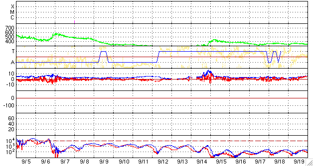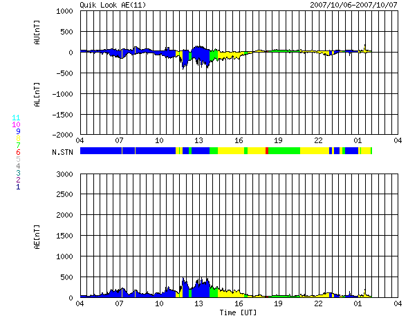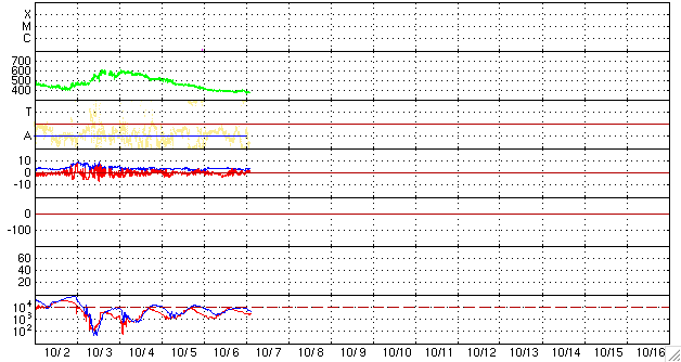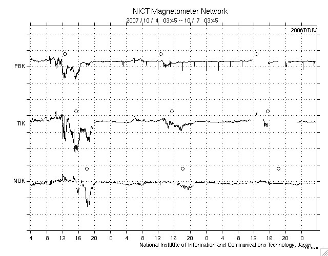 SOHO衛星のMDIカメラによる太陽黒点 (c) SOHO (ESA & NASA) ![]() ACEが観測した太陽風の磁場(1番上の枠、白線は全体の強度、赤線は南北成分) および、太陽風の密度(3番目の橙線)、速度(4番目の黄線) (c) NOAA/SWPC ![]() リアルタイムAE指数 下段のAEグラフの値が高くなると、オーロラ活動が活発化しています。 (c) 京都大学, NICT ![]() シベリアで観測された3日間の磁場データ 右側の3分の1が、昨日のデータになります。グラフが上がったり下がったりすると、オーロラ活動が活発化しています。 (c) NICT ![]() 27日の太陽周期に合わせたデータプロット 太陽が同じ面を地球に向けていた27日前の変化から、今後を予想することができます。 (c) NICT