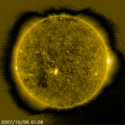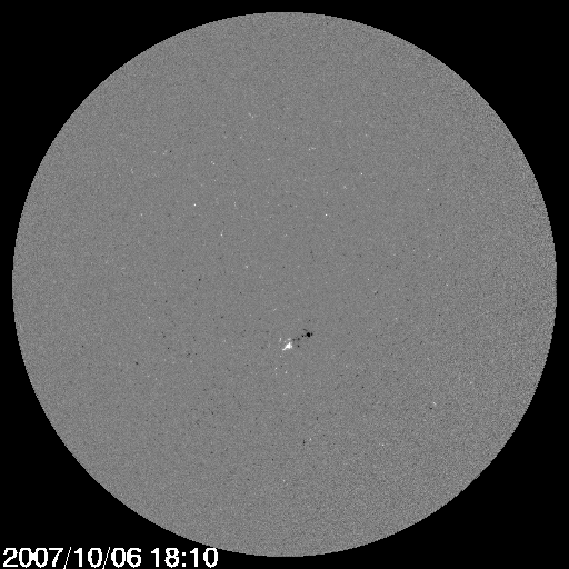 2007/10/ 7 12:41 更新 太陽風は低速風に変わりつつあります。新しく黒点群が出現しました。 担当 篠原 太陽面に新しい黒点群が出現しました。 太陽のほぼ中央で、972黒点群と番号が付けられています。 (正しくは、10,972群です。記事中では10,000を省略しています。) 小さな黒点群で、目立った活動は見られません。 今回も、黒点群は赤道付近に出現しました。 なかなか高緯度側へのジャンプが発生しません。 太陽活動が新しい周期に入る頃、 黒点が現れる位置が、南北両半球の高緯度側に移ります。 そろそろ起こってもよい頃ですので、待ち構えているところです。 今日は、太陽面の磁場分布の写真を掲載します。 中央やや南に、972黒点群に相当する磁場の構造が見えています。 右に黒(S極)、左に白(N極)が見えています。 太陽活動が新しい周期に入ると、この順番が逆転して、 右に白、左に黒が見えるようになります(南半球の黒点群の場合)。 この極性は、北半球に現れた黒点群では反対になります。 太陽風はゆっくりと速度が下がり、370km/秒と低速風に変わりつつあります。 磁場強度は3nTとやや弱めです。 太陽風が穏やかになり、磁気圏のオーロラ活動も概ね穏やかです。 AE指数では、400nTくらいの活動がひとつ見えている程度で、 他はほとんど変化がありません。 この静かな太陽風は当分続きそうです。 SOHO EIT284の太陽写真の南東(左下)のコロナホールが次第によく見えて来ました。 前周期からほとんど変化がない様です。 前回と同様であれば、12日頃に小規模の太陽風の乱れが来るでしょう。 前回の最高速度は、500km/秒にも達しませんでした。 放射線帯高エネルギー電子は減少して、警戒レベルを割りました。 まだやや高めの状態ですので、注意が必要かと思いますが、 この後もゆっくりと減少が続けます。 SOHO MDIカメラによる、太陽面の磁場の様子。7日3時(世界時6日18時)。 (c) ESA & NASA ![]() SOHO衛星のEIT284カメラの映像 (c) SOHO (ESA & NASA)