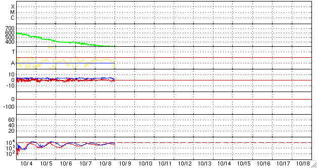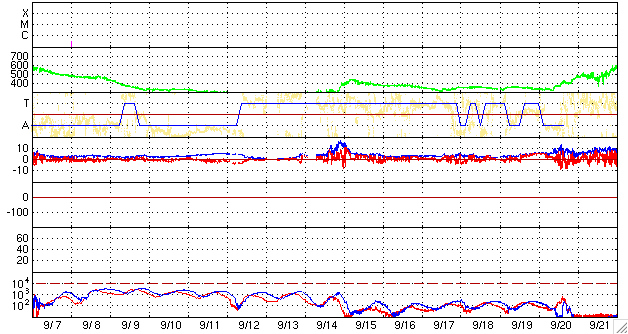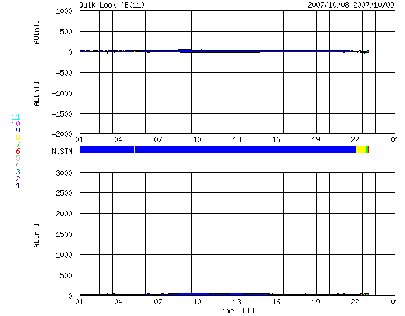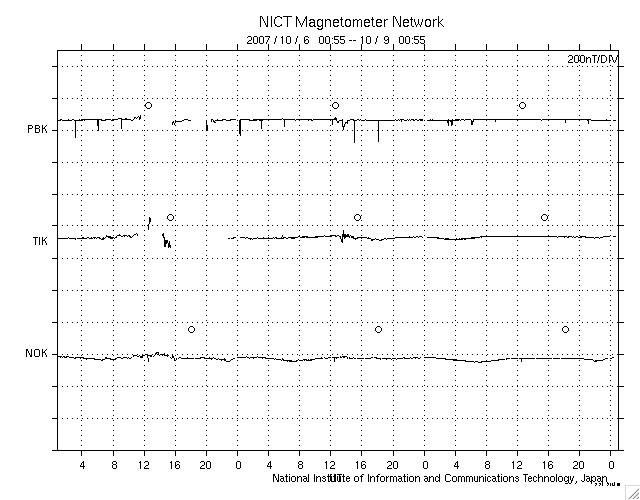 ACEが観測した太陽風の磁場(1番上の枠、白線は全体の強度、赤線は南北成分) および、太陽風の密度(3番目の橙線)、速度(4番目の黄線) (c) NOAA/SWPC ![]() リアルタイムAE指数 下段のAEグラフの値が高くなると、オーロラ活動が活発化しています。 (c) 京都大学, NICT ![]() シベリアで観測された3日間の磁場データ 右側の3分の1が、昨日のデータになります。グラフが上がったり下がったりすると、オーロラ活動が活発化しています。 (c) NICT ![]() 27日の太陽周期に合わせたデータプロット 太陽が同じ面を地球に向けていた27日前の変化から、今後を予想することができます。 (c) NICT