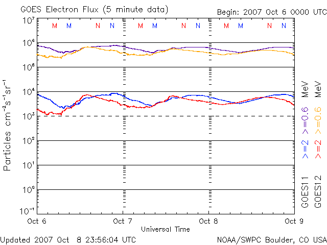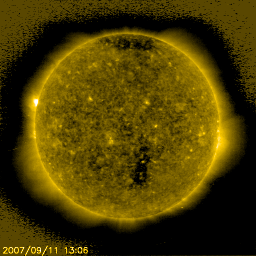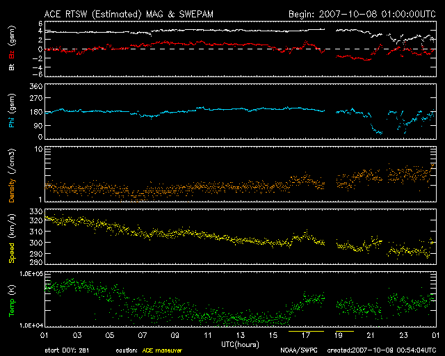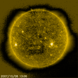 2007/10/ 9 09:55 更新 とても速度の遅い太陽風で、磁気圏はとても静穏です。太陽は無黒点に戻りました。 担当 篠原 宇宙天気情報BOXと、ニュースの左端の情報欄に、新たに黒点群のリストを加えました。 NOAA/SWPCが発表しているデータを用いています。 各黒点群の番号、黒点数とともに、 磁場構造のタイプ(活動度の目安になります)、 過去3日間に起こした最大のフレアの規模を掲載します。 今は黒点が少なくてさみしいリストですが、 来年、再来年と太陽活動が活発になるにつれ、にぎやかなリストとなるでしょう。 どうぞ楽しみにお待ちください。 情報は、毎朝10時頃に更新されます。 太陽風は、速度が290km/秒まで下がり、かなり低速の状態です。 磁場強度は4nTで、ほぼ普通の状態です。 ACEの最新のところで、磁場が乱れていますが、 これは、セクター境界が近づいているためかもしれません。 27日周期の図を見て下さい。 前周期の今日にあたる9月12日に、地球はセクターをまたいでいます。 この境界の前後では、太陽風はほとんど乱れていません。 太陽風の速度がかなり遅いので、磁気圏はとても穏やかです。 AE指数はぴったりと0にくっついていて、 シベリアの磁場データもほとんど変化がありません。 この静かな状態は明日も続くでしょう。 問題はその後の太陽風です。 SOHO EIT284で、27日前の太陽と比較してみましょう。 太陽の中心やや南にコロナホールが見えています。 前周期(右)と今回(左)を比較すると、 色はやや淡くなっていますが、東西方向により広がっているようです。 広がりが出ているということから、 今回は前よりももう少し太陽風に変化が見られるのかもしれません。 到来のタイミングは前回とほとんど一致しそうですので、 11日に磁場の乱れが始まり、12日に入った頃に速度が上がり始めるでしょう。 前回は最高速度が450km/秒と、たいした変化ではありませんでしたが、 今回はもう少し上がるのかもしれません。 大きな乱れになることはありませんが、どういう太陽風が来るのか注目してください。 放射線帯の高エネルギー電子は、やや高めで安定しています。 こちらは11-12日の乱れが来るまでは、減少はゆっくりです。 太陽は黒点が消えてしまいました。 SOHO衛星のEIT284カメラの映像 (c) SOHO (ESA & NASA)