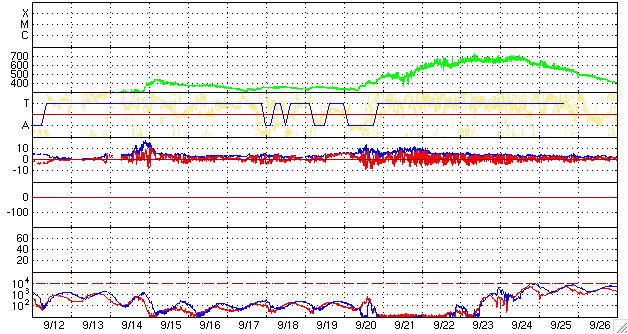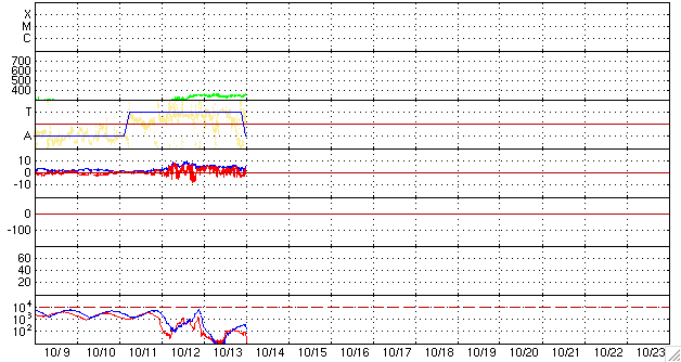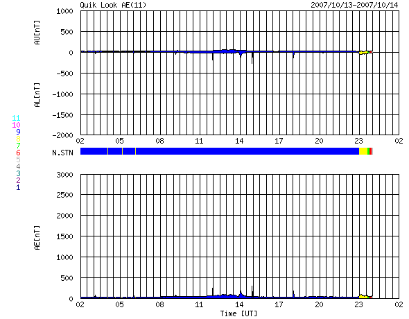 ACEが観測した太陽風の磁場(1番上の枠、白線は全体の強度、赤線は南北成分) および、太陽風の密度(3番目の橙線)、速度(4番目の黄線) (c) NOAA/SWPC ![]() リアルタイムAE指数 下段のAEグラフの値が高くなると、オーロラ活動が活発化しています。 (c) 京都大学, NICT ![]() シベリアで観測された3日間の磁場データ 右側の3分の1が、昨日のデータになります。グラフが上がったり下がったりすると、オーロラ活動が活発化しています。 (c) NICT ![]() 27日の太陽周期に合わせたデータプロット 太陽が同じ面を地球に向けていた27日前の変化から、今後を予想することができます。 (c) NICT
