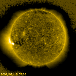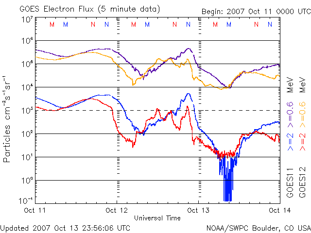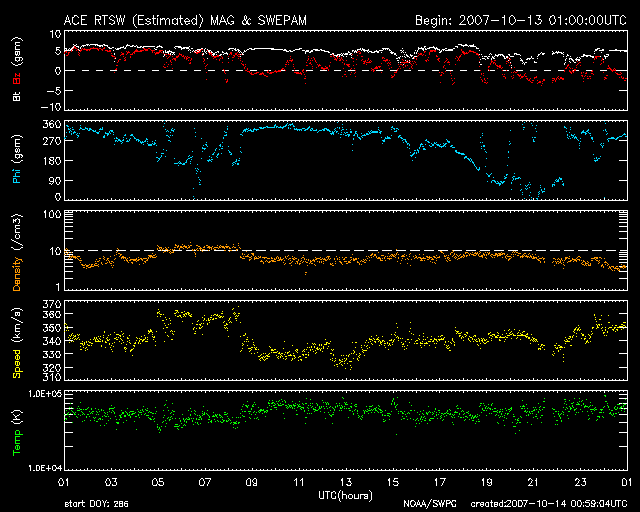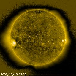 2007/10/14 10:00 更新 低速の太陽風が続いています。磁気圏もとても静かです。 担当 篠原 穏やかな太陽風が続いています。 速度は340km/秒と低速です。 磁場強度は、5nTと普通の強さを保っていますが、 南北成分は北寄りに推移しています。 このため、磁気圏はかなり静穏です。 AE指数、シベリア磁場データともに、ほとんど変化が見られません。 この状態は、しばらく続きそうです。 昨日も書きましたが、太陽の東からやって来ているコロナホールの姿が、 まだはっきりと見えないのです。 前周期(右の写真)と比べると、西側(右側)の広がりが減っている様に見えます。 そのために、なかなか姿がはっきりしないのかもしれません。 この写真の様子では、コロナホールの先端が太陽の中心に達するまで、 まだ3日くらいはかかりそうです。 そうなると、乱れの到来は6日後くらいになります。 また、明日のEIT284の写真を待ちましょう。 放射線帯の高エネルギー電子は、どんどん減っています。 次の高速風がやってくるまでは、低いレベルのままです。 太陽は無黒点です。 X線のグラフも最低レベルで、とても穏やかな太陽です。 SOHO衛星のEIT284カメラの映像 (c) SOHO (ESA & NASA)