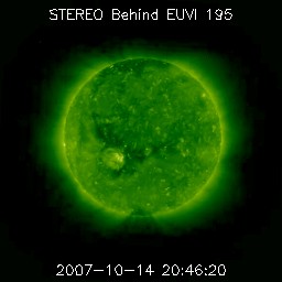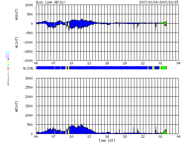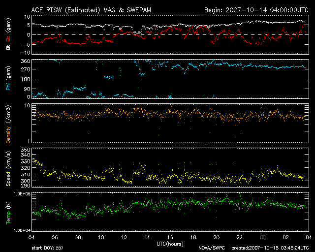2007/10/15 12:46 更新 太陽風は低速ですが、磁場が南を向き、オーロラが活動的になりました。 担当 篠原 低速の太陽風が続いています。 速度は310km/秒とかなり低速で安定しています。 一方、磁場強度は5nTと普通のレベルです。 注目されるのは、磁場の南北成分が昨日から南寄りに推移していたことです。 ACEの図を見てください。 4時間ほど欠けてしまいましたが、14日9時(世界時14日0時)ころから、 -5nTくらいの南向きが14日20時(世界時14日11時)まで続いていたのです。 そのため、磁気圏のオーロラ活動がやや活発になりました。 AE指数で300〜500nTの活動が記録されています。 アラスカではきれいなオーロラも見えていました。 その後、南北成分が一旦北寄りに変わり、磁気圏は穏やかになりました。 このように、太陽風が低速でも、 磁場の変動によってオーロラが強まることがあるのです。 とはいえ、太陽風自体は、もう3〜4日くらい低速が続きそうです。 今日はSTEREOの太陽コロナ写真を掲載します。 これを見ると、太陽の東側(左側)から中心付近にかけて、 三角形にコロナホールが分布しています。 STEREOは1日程先の様子を見ているので、 地球から見るコロナホールが太陽の中心に達するのは明日くらいになるでしょう。 そこから計算すると、本格的な太陽風の変化は4日後くらいになるかもしれません。 しかし、前周期の様子を加味すると、18日からは注意が必要になるでしょう。 今度やって来る高速風は、前回は最高速度が700km/秒近くに達し、 5日ほど高速状態が続きました。 活発なオーロラも見られています。 太陽は無黒点が続いています。 コロナホールの近くにやや明るい領域が見えますが、 磁場の構造はあるものの、黒点にまでは発達していません。 STEREO衛星紫外線望遠鏡EUVI195の太陽写真。15日6時(世界時14日21時) (c) NASA ![]() ACEが観測した太陽風の磁場(1番上の枠、白線は全体の強度、赤線は南北成分) および、太陽風の密度(3番目の橙線)、速度(4番目の黄線) (c) NOAA/SWPC ![]() リアルタイムAE指数 下段のAEグラフの値が高くなると、オーロラ活動が活発化しています。 (c) 京都大学, NICT ![]() シベリアで観測された3日間の磁場データ 右側の3分の1が、昨日のデータになります。グラフが上がったり下がったりすると、オーロラ活動が活発化しています。 (c) NICT ![]() 27日の太陽周期に合わせたデータプロット 太陽が同じ面を地球に向けていた27日前の変化から、今後を予想することができます。 (c) NICT