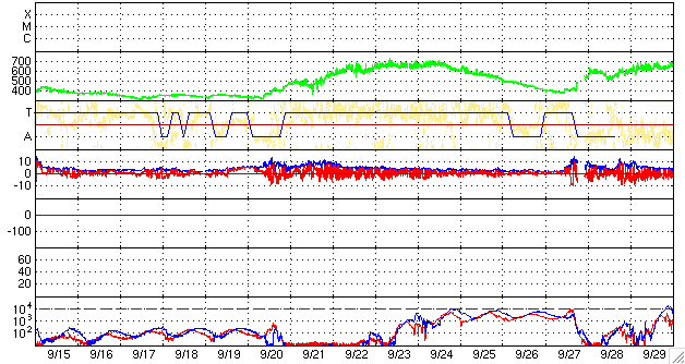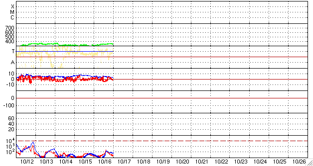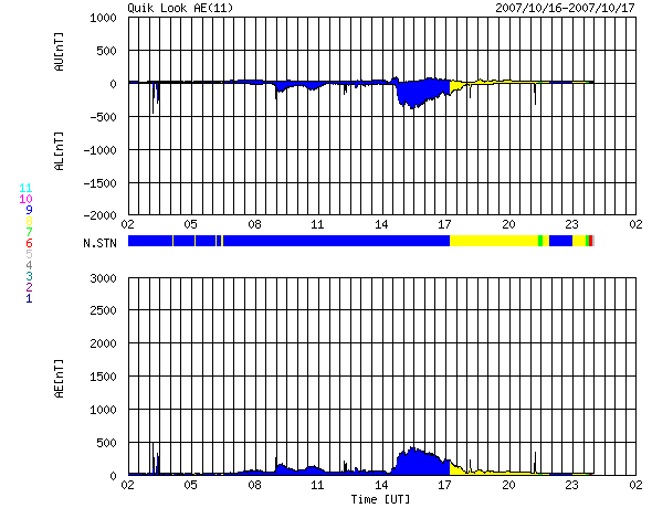 ACEが観測した太陽風の磁場(1番上の枠、白線は全体の強度、赤線は南北成分) および、太陽風の密度(3番目の橙線)、速度(4番目の黄線) (c) NOAA/SWPC ![]() リアルタイムAE指数 下段のAEグラフの値が高くなると、オーロラ活動が活発化しています。 (c) 京都大学, NICT ![]() シベリアで観測された3日間の磁場データ 右側の3分の1が、昨日のデータになります。グラフが上がったり下がったりすると、オーロラ活動が活発化しています。 (c) NICT ![]() 27日の太陽周期に合わせたデータプロット 太陽が同じ面を地球に向けていた27日前の変化から、今後を予想することができます。 (c) NICT