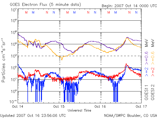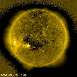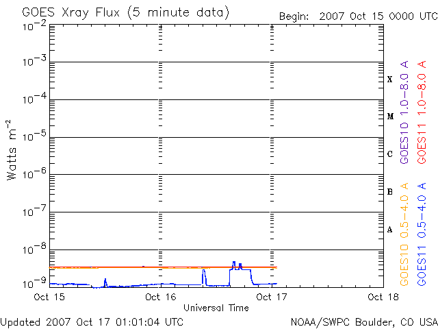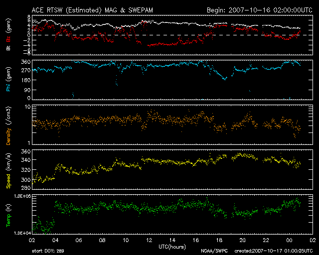 2007/10/17 10:01 更新 太陽風の速度は340km/秒と低速で、磁気圏も概ね静穏です。明日以降高速風がやってきます。 担当 篠原 太陽風は少し速度を上げて、340km/秒になっています。 低速であることに変わりはありません。 磁場強度は、4nT前後で推移しています。 南北成分を見ると、その強度いっぱいに南北にゆっくりと変化しています。 ACEの図の真ん中あたりで、南向きが数時間続くところがあり、 この時間帯に、AE指数で400nTくらいのオーロラ活動が発生しました。 速度が遅いので、変化は小規模でした。 その他はほとんど活動はなく、磁気圏は基本的に静穏です。 太陽風は、今日いっぱいは穏やかに過ぎて行くでしょう。 明日の後半か明後日くらいから、高速風がやって来ると予想しています。 SOHO EIT284の太陽写真を見てください。 最新と、27日前の写真を比較しています。 コロナホールはだいたい似た様な場所に広がっています。 ただ、明るい領域が コロナホールのまん中に入り込んできて、 コロナホールは全体的に淡くなったようにも見えます。 この変化が高速太陽風にどのような影響を与えるのでしょうか。 これからやってくる高速風は、 前周期は最高速度が700km/秒近くに達し、高速風は5日ほど続きました。 この規模が今後の太陽風擾乱の目安になります。 放射線帯の高エネルギー電子は、低いレベルで安定しています。 高速風がやってくると上昇する可能性がありますので、 高速風到来後は変化に注目してください。 太陽はとても静穏です。 無黒点が続いています。 SOHO衛星のEIT284カメラの映像 (c) SOHO (ESA & NASA)