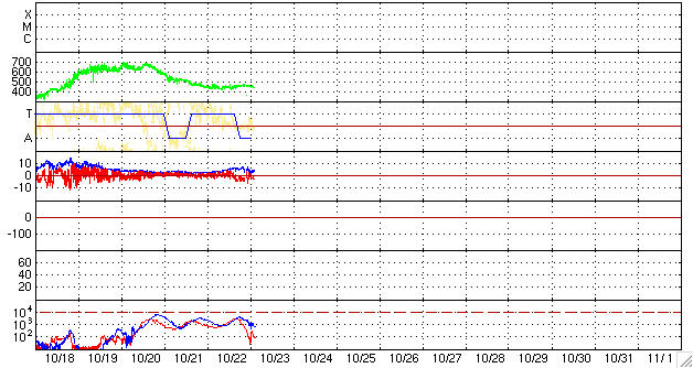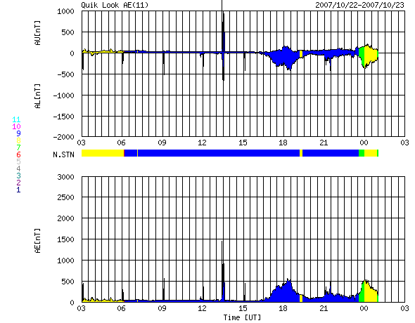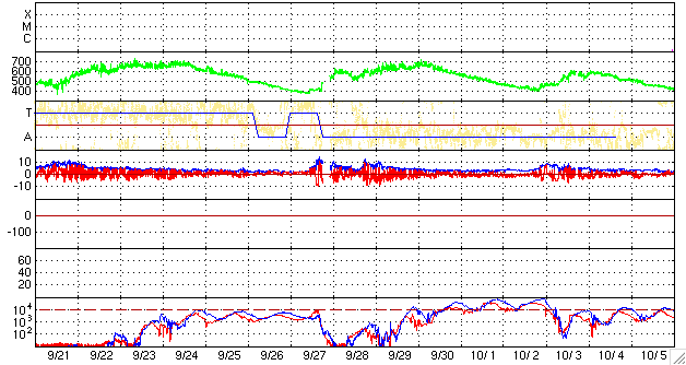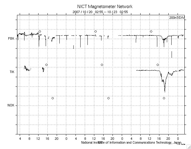 ACEが観測した太陽風の磁場(1番上の枠、白線は全体の強度、赤線は南北成分) および、太陽風の密度(3番目の橙線)、速度(4番目の黄線) (c) NOAA/SWPC ![]() リアルタイムAE指数 下段のAEグラフの値が高くなると、オーロラ活動が活発化しています。 (c) 京都大学, NICT ![]() シベリアで観測された3日間の磁場データ 右側の3分の1が、昨日のデータになります。グラフが上がったり下がったりすると、オーロラ活動が活発化しています。 (c) NICT ![]() 27日の太陽周期に合わせたデータプロット 太陽が同じ面を地球に向けていた27日前の変化から、今後を予想することができます。 (c) NICT