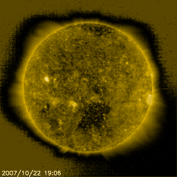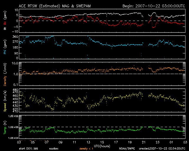 2007/10/23 11:55 更新 太陽風はやや高めの速度で安定していて(450km/秒)、オーロラ活動も発生しています。 担当 篠原 地球が高速風帯を抜けた後、太陽風の速度が下がって来たのですが、 450km/秒あたりで下げ止まって、やや高めの状態が続いています。 このあたり、コロナホールの影響が残っているのでしょうか。 一方、磁場強度は3nTから5nTへと、 強さとしては普通のレベルですが、やや回復しています。 目立った変化として、ACEの図の後半で、 -3nTくらいの南向きが安定して長時間続いています。 この影響で磁気圏がやや活動的になり、 500nTの小規模のオーロラ活動が2回ほど発生しました。 そのひとつは、シベリアの磁場データでも大きく見えています。 太陽風磁場の南寄りの傾向は現在も続いていて、 引き続き、小規模のオーロラ活動が発生しそうです。 SOHO EIT284の太陽写真を見ると、 コロナホールが太陽の中央部南寄りを通過しつつあります。 昨日のSTEREOの写真と比較してください。 昨日のSTEREOの写真でも、ほぼ同じ位置にコロナホールが見えていました。 STEREOの写真では1日ほど先を見ているということの確認になります。 さて、現在、このコロナホールから速度の高い太陽風が、 地球に向かって吹き出しています。 コロナホールは太陽の磁場が外へ向かって広がっていく場所です。 その磁場に沿って、太陽の高温のコロナガスが吹き出しています。 今、太陽から吹き出しているプラズマの流れは、3日くらいかけて地球までやってきます。 コロナホールの先頭(右端)は既に太陽の中心を通過して、 そこからの高速太陽風が、明日の後半か明後日にやって来ると予想しています。 27日周期の図を見てください。 前周期、9月27日(図は世界時です)に始まっている高速風の回帰です。 速度が上がるとともに、オーロラも活動的になるでしょう。 高速風は4日間ほど続くと思われます。 放射線帯の高エネルギー電子は、数が減少しています。 磁気圏活動の影響でしょう。 次の高速風の中盤頃から上昇を始めると思います。 明後日くらいから注意を始めて下さい。 太陽は無黒点で、とても穏やかです。 SOHO衛星のEIT284カメラの映像 (c) SOHO (ESA & NASA)