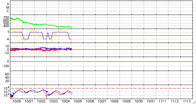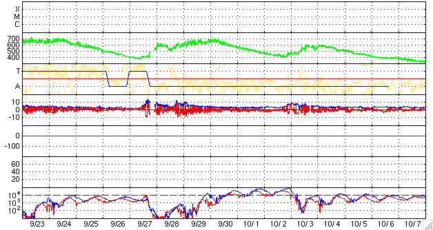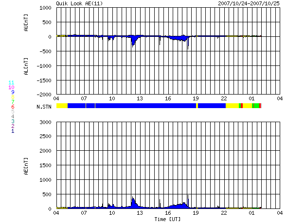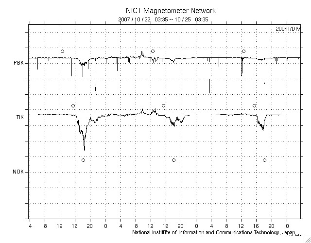 ACEが観測した太陽風の磁場(1番上の枠、白線は全体の強度、赤線は南北成分) および、太陽風の密度(3番目の橙線)、速度(4番目の黄線) (c) NOAA/SWPC ![]() リアルタイムAE指数 下段のAEグラフの値が高くなると、オーロラ活動が活発化しています。 (c) 京都大学, NICT ![]() シベリアで観測された3日間の磁場データ 右側の3分の1が、昨日のデータになります。グラフが上がったり下がったりすると、オーロラ活動が活発化しています。 (c) NICT ![]() 27日の太陽周期に合わせたデータプロット 太陽が同じ面を地球に向けていた27日前の変化から、今後を予想することができます。 (c) NICT