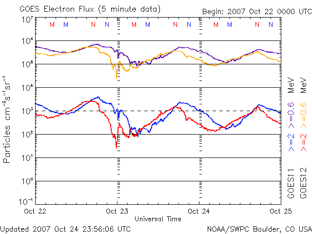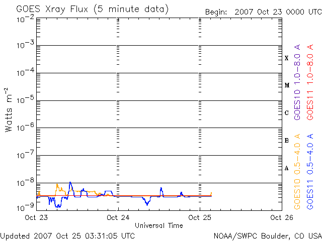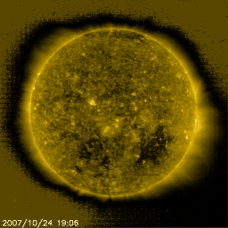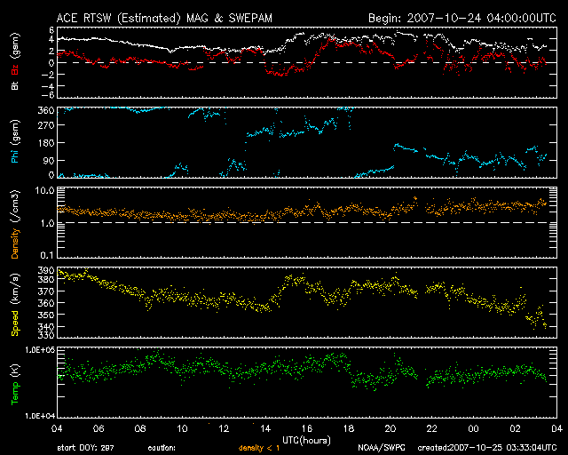 2007/10/25 12:34 更新 低速の穏やかな太陽風が続いています。高速風の到来はこれからです。 担当 篠原 今日は更新が遅くなりました。 今後も、月曜と木曜はこの時間になると思います。 予想を裏切って、穏やかな太陽風が続いています。 速度は350km/秒と低く、磁場強度も2〜4nTに弱まったままです。 27日周期の図を見てください。 前周期よりも半日程度、高速風の到来が遅れています。 セクターのグラフを見ると、 こちらはやや遅れる程度で「T」から「A」に切り替わっています。 ですので、そろそろ磁場強度、速度にも変化が現れるのではないかと思います。 SOHO EIT284の太陽写真では、コロナホールは十分西側に移動しています。 タイミングとしては、高速風がやって来てもよい頃です。 ここまでの磁気圏は、概ね静穏です。 小規模のオーロラ活動がAE指数で見えていますが、時間も短いものです。 この後も、太陽風に変化が始まるまでは、静穏に過ぎて行くでしょう。 放射線帯の高エネルギー電子は、静かに現状を保っています。 高速風の到来までは、問題はありません。 太陽は黒点の無い、穏やかな状態です。 X線のグラフも低いですが、SOHO EIT284に明るい部分が全く見えていません。 たいへん静かであることがよく分かります。 SOHO衛星のEIT284カメラの映像 (c) SOHO (ESA & NASA)