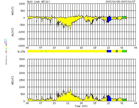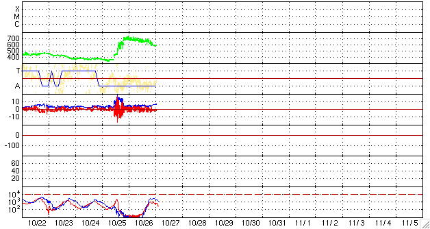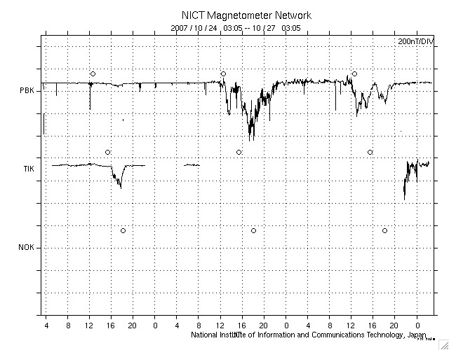 ACEが観測した太陽風の磁場(1番上の枠、白線は全体の強度、赤線は南北成分) および、太陽風の密度(3番目の橙線)、速度(4番目の黄線) (c) NOAA/SWPC ![]() リアルタイムAE指数 下段のAEグラフの値が高くなると、オーロラ活動が活発化しています。 (c) 京都大学, NICT ![]() シベリアで観測された3日間の磁場データ 右側の3分の1が、昨日のデータになります。グラフが上がったり下がったりすると、オーロラ活動が活発化しています。 (c) NICT ![]() 27日の太陽周期に合わせたデータプロット 太陽が同じ面を地球に向けていた27日前の変化から、今後を予想することができます。 (c) NICT