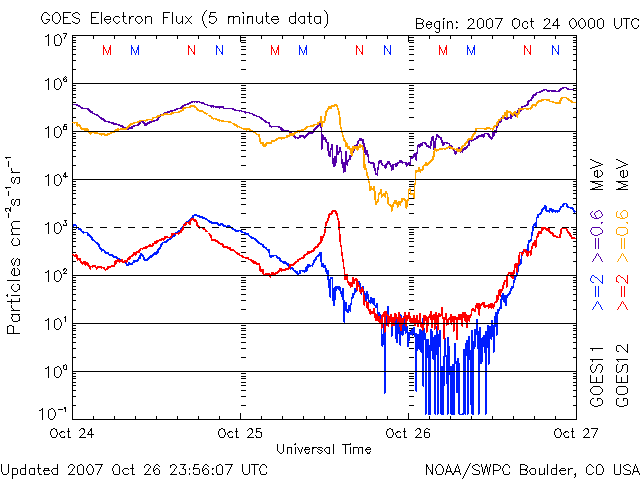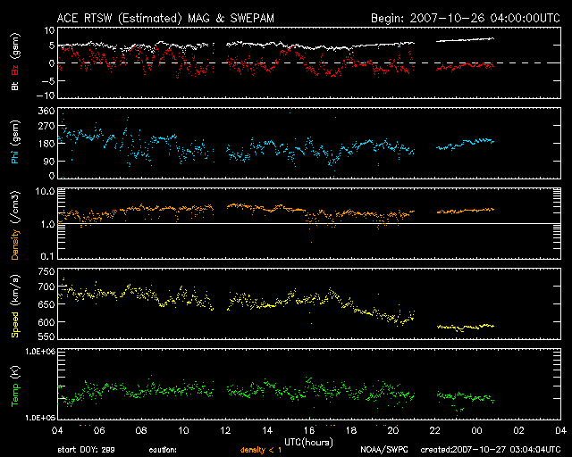 2007/10/27 12:05 更新 高速の太陽風が続いています(580km/秒)。オーロラも活発に発生しています。 担当 篠原 高速の太陽風と、活発なオーロラ活動が続いています。 昨日より、太陽風は650km/秒の高速な状態が続いていました。 今日の未明になって一段下がり、現在は580km/秒となっています。 それでも、まだかなり高速です。 太陽風の磁場強度は、5nTのレベルを保っています。 速度が下がり始める頃は、3nTくらいに弱まることが多いのですが、 下がりきらずに、むしろ7nTくらいに強まっています。 従って、高速風はこのまますぐに速度を下げるのではなく、 もうしばらく現在の速度レベルを保つかもしれません。 太陽風の磁場は、振幅は+3nTから-3nTくらいで南北に変化しています。 振幅はたいしたものではありませんが、速度がかなり高くなっているので、 磁気圏へのエネルギーの流れ込みが続き、オーロラの活動度は比較的活発です。 AE指数では、500nTから1000nTの中規模の変動が続いています。 ただ、後半は速度がやや下がったので、変化も弱まる傾向が見えます。 27日周期の図によると、高速風はこれから後半に入りそうですが、 到来が遅れた分、後半も様子が変わっているかもしれません。 また、4日後くらいに見られる、次の速度の山がどうなるかも興味が持たれます。 今日のSOHO EIT284でも、次のコロナホールはとても淡く、 影響は弱まっているかもしれません。 放射線帯の高エネルギー電子は、増加に転じています。 しかし、速度が高まった割に、上昇幅はやや小さいようにも感じます。 引き続き上昇すると思いますので、今後の変化に注意してください。 太陽はたいへん穏やかです。 黒点は今日もありません。 SOHO衛星のEIT284カメラの映像 (c) SOHO (ESA & NASA)
