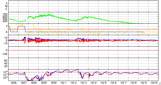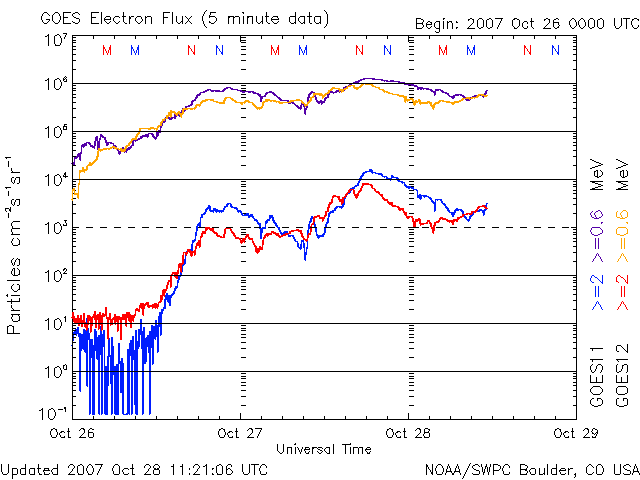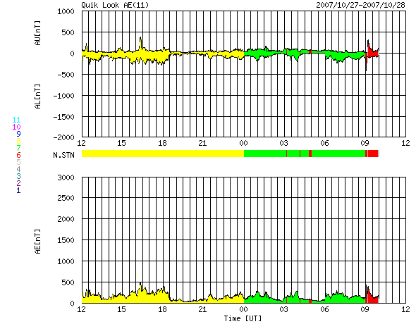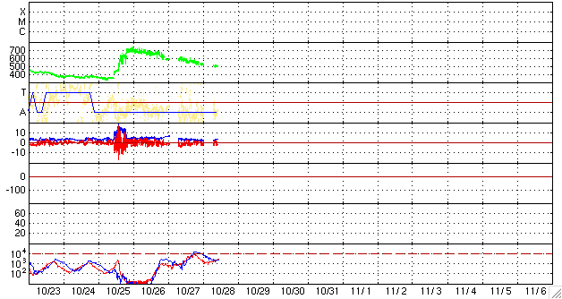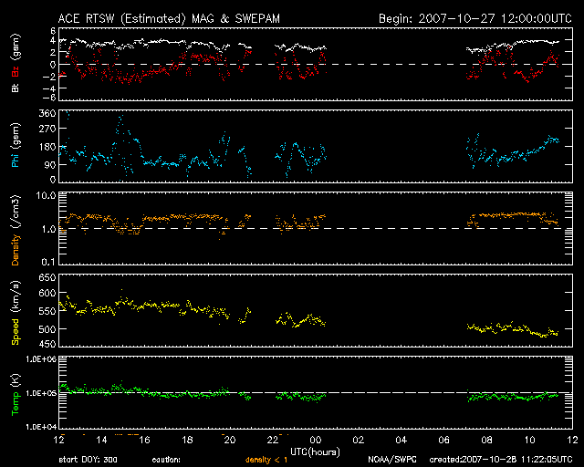 2007/10/28 20:23 更新 太陽風の速度はゆっくりと下がり、高速風は終わりに近づいています。 担当 篠原 今日は更新がすっかり遅くなってしまい、申し訳ありませんでした。 太陽風はゆっくりと速度を下げ続け、500km/秒を切ったところです。 高速風も終わりに近づいています。 27日周期の図を見ると、前回と同じようなペースで速度が下がっています。 このまま明日にかけて下がり続けるでしょう。 問題はその次に来ると予想される、第二の山がどうなるかです。 一昨日の記事で比較した様に、SOHO EIT294の太陽コロナ写真では、 コロナホールが前よりも淡くなっている様に感じます。 30日から速度がどのように変化するか、注目です。 (今日は、STEREOの写真を掲載しています) 太陽風の速度が下がったので、磁気圏のオーロラ活動は弱まっています。 AE指数で、300nTくらいの小規模変動が続く程度です。 この後、一層穏やかになるでしょう。 放射線帯の高エネルギー電子は、一段増加して、 警戒レベルの10,000にちょうど達しています。 速度が下がって来ているので、これ以上大きく増えることはないと思いますが、 もうしばらく注目してください。 太陽は無黒点で、穏やかです。 STEREO衛星紫外線望遠鏡EUVI195の太陽写真。28日7時(世界時27日22時) (c) NASA ![]() ACEが観測した太陽風の磁場(1番上の枠、白線は全体の強度、赤線は南北成分) および、太陽風の密度(3番目の橙線)、速度(4番目の黄線) (c) NOAA/SWPC ![]() リアルタイムAE指数 下段のAEグラフの値が高くなると、オーロラ活動が活発化しています。 (c) 京都大学, NICT ![]() シベリアで観測された3日間の磁場データ 右側の3分の1が、昨日のデータになります。グラフが上がったり下がったりすると、オーロラ活動が活発化しています。 (c) NICT ![]() 27日の太陽周期に合わせたデータプロット 太陽が同じ面を地球に向けていた27日前の変化から、今後を予想することができます。 (c) NICT