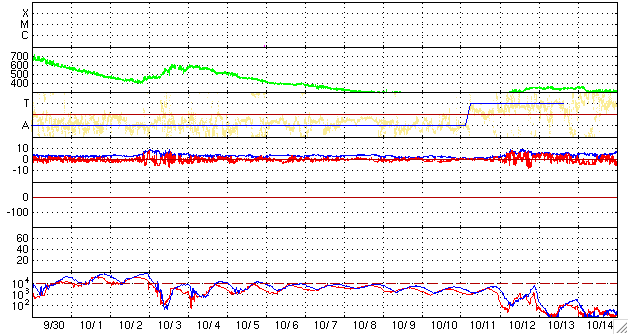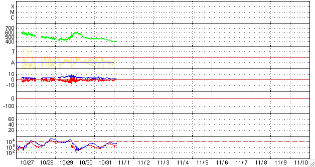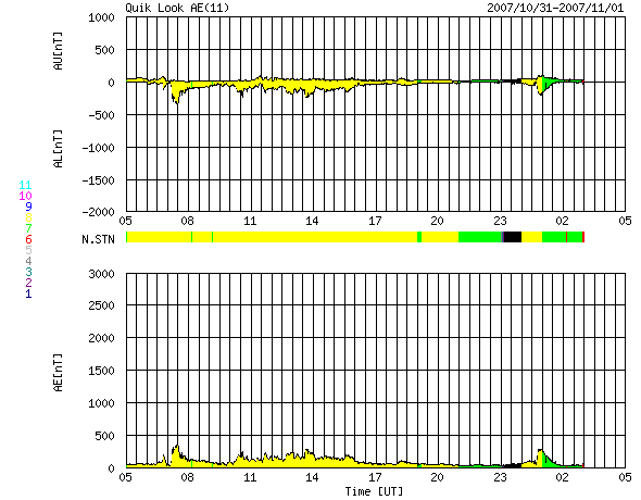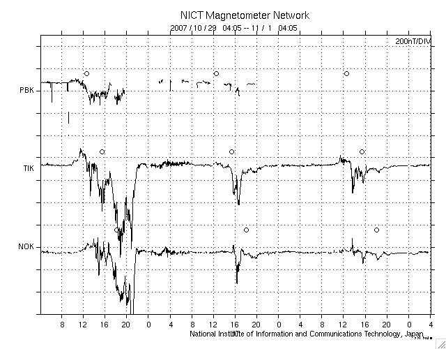 ACEが観測した太陽風の磁場(1番上の枠、白線は全体の強度、赤線は南北成分) および、太陽風の密度(3番目の橙線)、速度(4番目の黄線) (c) NOAA/SWPC ![]() リアルタイムAE指数 下段のAEグラフの値が高くなると、オーロラ活動が活発化しています。 (c) 京都大学, NICT ![]() シベリアで観測された3日間の磁場データ 右側の3分の1が、昨日のデータになります。グラフが上がったり下がったりすると、オーロラ活動が活発化しています。 (c) NICT ![]() 27日の太陽周期に合わせたデータプロット 太陽が同じ面を地球に向けていた27日前の変化から、今後を予想することができます。 (c) NICT