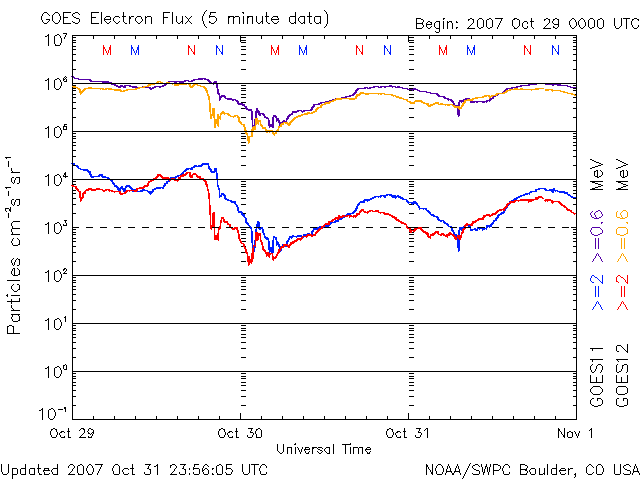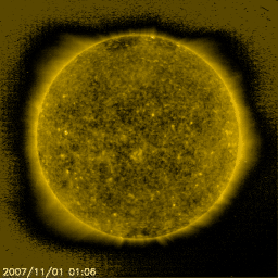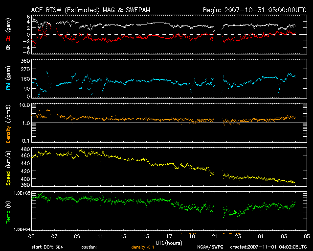 2007/11/ 1 13:03 更新 太陽風の速度は下がり続け、通常の速度に戻りました。これから2週間くらい穏やかになるでしょう。 担当 篠原 昨日より、太陽風の速度は低下を続けています。 先ほど400km/秒を割ったところです。 太陽風が落ち着いて来て、磁気圏活動は概ね静穏です。 AE指数では200〜300nTの小さな変化が続いて見えています。 これは、太陽風磁場が小振幅ながら(-2nT以下)、 ずっと南寄りになっていたためでしょう。 ここで太陽風の速度が高ければ、もう少し大きな活動になったでしょう。 オーロラ活動の規模は、太陽風の速度と磁場の南向きの強さに関係しています。 27日周期の図を見てください。 今回の小規模の高速風が過ぎると、このあとかなり長い期間低速で穏やかな日が続きます。 前周期のグラフでは、10月6日以降、400km/秒以下の低速風が 図の右端(10月14日)まで続いています。 左のリンクから、27日周期の図の完全版を選んでください。 太陽風の変化は、10月18日になってやっと始まっています。 これは、今周期では11月14日に相当します。 これから約2週間、とても静かな日が続くと予想されます。 SOHO EIT284の太陽コロナ写真を見てください。 全体が完全にのっぺりとしていて、 明るいところも、暗いところも、ほとんどむらがありません。 27日周期の図の予想通りに、今後は進みそうです。 放射線帯高エネルギー電子は、やや高めのところで安定しています。 今後は、ゆっくりと減少していくでしょう。 太陽は無黒点で、とても穏やかです。 こちらも全く変化が見られません。 黒点が最後に見えたのは、10月8日でした。 このまま1ヶ月に達するかもしれません。 SOHO衛星のEIT284カメラの映像 (c) SOHO (ESA & NASA)