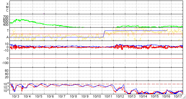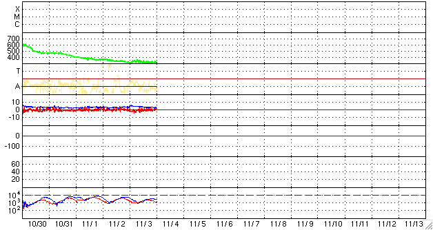 ACEが観測した太陽風の磁場(1番上の枠、白線は全体の強度、赤線は南北成分) および、太陽風の密度(3番目の橙線)、速度(4番目の黄線) (c) NOAA/SWPC ![]() リアルタイムAE指数 下段のAEグラフの値が高くなると、オーロラ活動が活発化しています。 (c) 京都大学, NICT ![]() シベリアで観測された3日間の磁場データ 右側の3分の1が、昨日のデータになります。グラフが上がったり下がったりすると、オーロラ活動が活発化しています。 (c) NICT ![]() 27日の太陽周期に合わせたデータプロット 太陽が同じ面を地球に向けていた27日前の変化から、今後を予想することができます。 (c) NICT