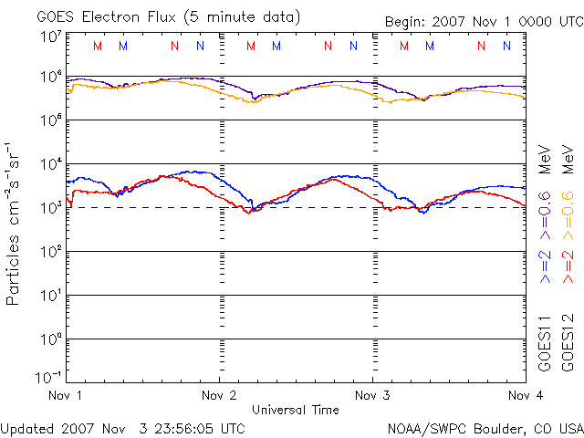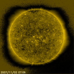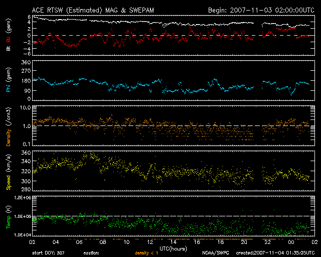 2007/11/ 4 10:36 更新 低速の太陽風が続いています(320km/秒)。磁気圏もとても静かです。 担当 篠原 速度の遅い太陽風が続いています。 太陽風の速度は、昨日より320km/秒で安定した状態が続いています。 磁場強度も4nTでほぼ安定しています。 速度が遅いので、磁気圏内もかなり静穏です。 AE指数では、200nTほどの小さな活動がひとつ見えているだけです。 太陽風が遅いといっても、南向き磁場の変化によってこの程度の活動は起こります。 ただ、これ以上活発な変化にはつながらないでしょう。 (速度が遅くても、磁場強度が強まっている場合は、状況が異なります) SOHO EIT284の太陽写真を見て下さい。 暗いコロナホールも、明るい活動的な領域も、どちらも見られません。 とても穏やかな太陽面です。 このため、27日周期で予想される通り、この静穏な状態は長く続くでしょう。 細かく見ると、11月7日頃にセクター境界がやってきます。 その後、多少、太陽風磁場がざわつくかもしれません。 本格的な太陽風の乱れは、14日頃と予想されます。 明日になると、掲載している27日周期の図でもその様子が見えてきます。 放射線帯高エネルギー電子は、ゆっくりと減少を続けています。 太陽は無黒点です。 X線のグラフは全く変化がありません。 SOHO衛星のEIT284カメラの映像 (c) SOHO (ESA & NASA)