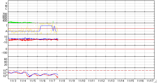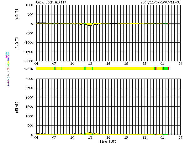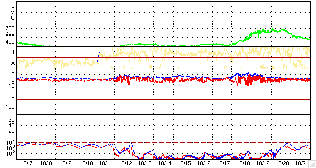 ACEが観測した太陽風の磁場(1番上の枠、白線は全体の強度、赤線は南北成分) および、太陽風の密度(3番目の橙線)、速度(4番目の黄線) (c) NOAA/SWPC ![]() リアルタイムAE指数 下段のAEグラフの値が高くなると、オーロラ活動が活発化しています。 (c) 京都大学, NICT ![]() シベリアで観測された3日間の磁場データ 右側の3分の1が、昨日のデータになります。グラフが上がったり下がったりすると、オーロラ活動が活発化しています。 (c) NICT ![]() 27日の太陽周期に合わせたデータプロット 太陽が同じ面を地球に向けていた27日前の変化から、今後を予想することができます。 (c) NICT
