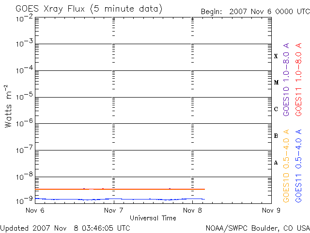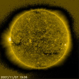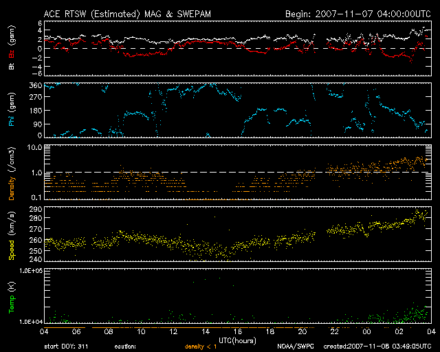 2007/11/ 8 12:50 更新 とても速度の遅い太陽風が続いています。磁気圏もとても静かです。 担当 篠原 かなり速度の遅い太陽風が続いています。 昨日より、260km/秒の状態が続きましたが、 今朝に入ってやや上がって、現在は280km/秒です。 磁気圏もたいへん穏やかで、AE指数はほとんど平らです。 シベリア磁場データを見ても、3日間通して全く変化が見られません。 27日周期の図によると、昨日切り替わったセクターがまた戻っています。 太陽の磁場構造もいろいろと変化しているようです。 前周期の太陽風を見ると、これから磁場強度がやや強まる変化が見られそうですが、 今周期はどうなるでしょうか。 SOHO EIT284の太陽コロナ写真では、太陽の東端(左端)に細長く、 コロナホールの黒い筋が見えています。 前周期とは様子が変わっている様です。 明日か明後日になれば、分布がはっきりと分かるでしょう。 予想通りというか、昨日出現した太陽の小さな黒点は、 今日は見えなくなってしまいました。 太陽は再び無黒点です。 SOHO EIT284を見ると、東端(左端)から明るい領域が上がりつつあります。 ここに黒点はあるでしょうか。 SOHO衛星のEIT284カメラの映像 (c) SOHO (ESA & NASA)