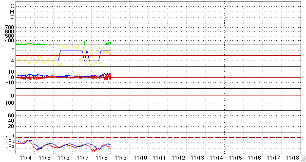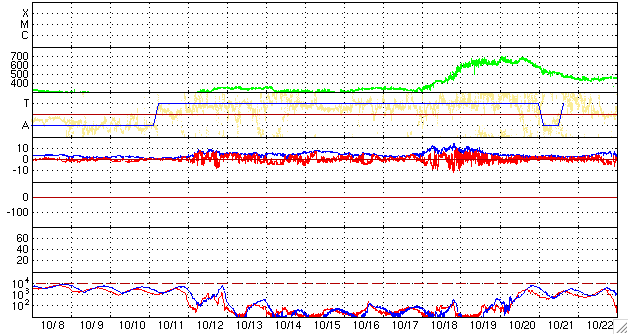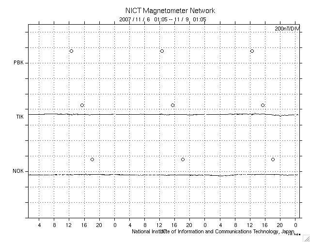 ACEが観測した太陽風の磁場(1番上の枠、白線は全体の強度、赤線は南北成分) および、太陽風の密度(3番目の橙線)、速度(4番目の黄線) (c) NOAA/SWPC ![]() リアルタイムAE指数 下段のAEグラフの値が高くなると、オーロラ活動が活発化しています。 (c) 京都大学, NICT ![]() シベリアで観測された3日間の磁場データ 右側の3分の1が、昨日のデータになります。グラフが上がったり下がったりすると、オーロラ活動が活発化しています。 (c) NICT ![]() 27日の太陽周期に合わせたデータプロット 太陽が同じ面を地球に向けていた27日前の変化から、今後を予想することができます。 (c) NICT