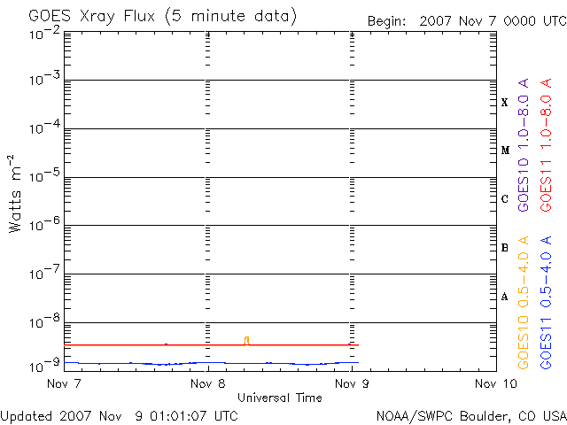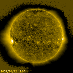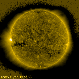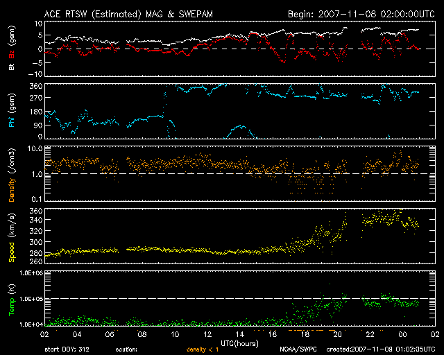 2007/11/ 9 10:03 更新 太陽風は低速ですが、やや速度が上がっています。磁場強度もやや強まり、オーロラを起こすようになるかもしれません。 担当 篠原 今日未明に入って、太陽風が多少乱れています。 速度が、280km/秒から340km/秒に上昇し、 磁場強度が、3nTから7nTに強まっています。 27日周期で、前周期10月12日に始まっていた変化が回帰したものと考えられます。 速度が上がったといっても、依然、平均以下の低速風です。 ただ、磁場強度が強まったことで、 南を向いた時に小規模のオーロラ活動を起こすようになるでしょう。 アラスカのライブカメラでは、少し楽しみな状況になったと言えます。 ここまでのところ、磁気圏はとても穏やかです。 AE指数、シベリア磁場データともに全く変化が見られません。 今後も、基本的には静穏な状態が続くでしょう。 SOHO EIT284の太陽コロナを見てください。 2枚掲載していますが、左が最新、右が27日前(太陽が1回転する期間)の太陽です。 注目して欲しいのは、東端(左端)に横に細長く見えるコロナホールです。 このコロナホールは、前周期の太陽ではほとんど見えていません(多少影が見えますが)。 今周期に入って、規模が大きくなった様です。 現在の位置から考えると、もう2日ほどで太陽の中心線に達し、 その3日後くらいから地球に影響を及ぼす可能性があります。 すると、13日くらいから太陽風の変化が始まるかもしれません。 前周期よりも高速風の到来がやや早まると予想されます。 明日、明後日とコロナホールはよりはっきりと見えるようになります。 再び前周期の様子と比較してみましょう。 太陽は無黒点のままです。 SOHO EIT284では、東の端から明るい領域が上がって来ましたが、 規模は小さく、黒点は伴っていませんでした。 SOHO衛星のEIT284カメラの映像 (c) SOHO (ESA & NASA)