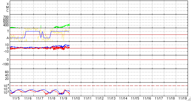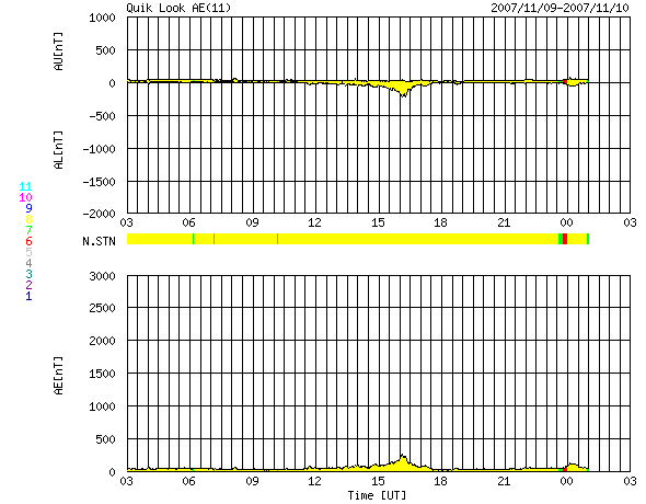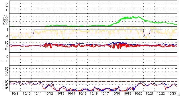 ACEが観測した太陽風の磁場(1番上の枠、白線は全体の強度、赤線は南北成分) および、太陽風の密度(3番目の橙線)、速度(4番目の黄線) (c) NOAA/SWPC ![]() リアルタイムAE指数 下段のAEグラフの値が高くなると、オーロラ活動が活発化しています。 (c) 京都大学, NICT ![]() シベリアで観測された3日間の磁場データ 右側の3分の1が、昨日のデータになります。グラフが上がったり下がったりすると、オーロラ活動が活発化しています。 (c) NICT ![]() 27日の太陽周期に合わせたデータプロット 太陽が同じ面を地球に向けていた27日前の変化から、今後を予想することができます。 (c) NICT