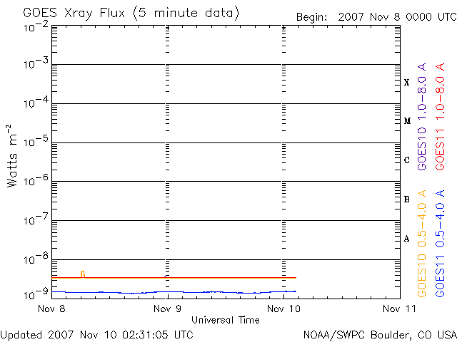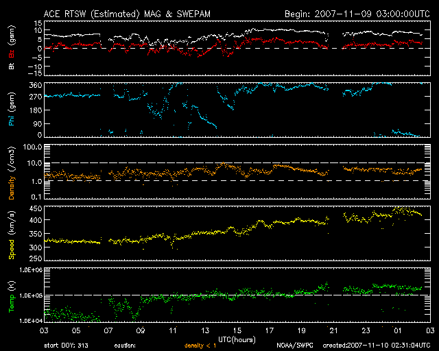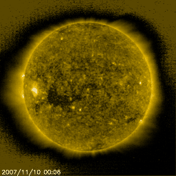 2007/11/10 11:32 更新 太陽風の速度が400km/秒台に上がっています。引き続き上昇するかもしれません。 担当 篠原 午前10時から1時間ほど、誤って以前の記事が今日の記事として掲載されていました。 申し訳ありませんでした。 昨日から始まった太陽風の乱れが、もう一段強まっています。 昨日のニュースの後、磁場強度が10nTにまで強まり、 同じく速度も上昇を始め、現在、430km/秒に達しています。 速度としては、通常よりやや高めという程度で、大きな乱れではありません。 しかし、前周期の太陽風と比較すると、コロナホールの影響が強まっています。 磁場強度はまだ8nTに強まったままです。 引き続き速度が上がり、500km/秒近くになるかもしれません。 ここまでの太陽風磁場の南北成分は北寄りになっています。 このため、磁気圏への影響はそれほど見られません。 AE指数には小さな変化がひとつある程度です。 しかし、今後、磁場の方向が南向きに切り替わった場合は、 オーロラも活発になるでしょう。 現在の太陽風の乱れは、明日くらいまでではないかと思います。 SOHO EIT284では、次のコロナホールが太陽の中心東寄りに大きく見えて来ました。 その先端(右端)は太陽の中心に達しつつあります。 こちらの影響は13-14日くらいに始まるでしょう。 太陽は黒点がないままです。 X線のグラフは完全に平らになっています。 SOHO衛星のEIT284カメラの映像 (c) SOHO (ESA & NASA)