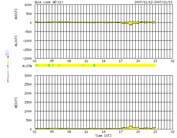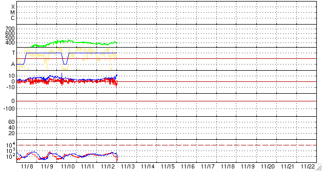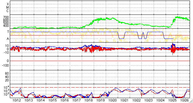 ACEが観測した太陽風の磁場(1番上の枠、白線は全体の強度、赤線は南北成分) および、太陽風の密度(3番目の橙線)、速度(4番目の黄線) (c) NOAA/SWPC ![]() リアルタイムAE指数 下段のAEグラフの値が高くなると、オーロラ活動が活発化しています。 (c) 京都大学, NICT ![]() シベリアで観測された3日間の磁場データ 右側の3分の1が、昨日のデータになります。グラフが上がったり下がったりすると、オーロラ活動が活発化しています。 (c) NICT ![]() 27日の太陽周期に合わせたデータプロット 太陽が同じ面を地球に向けていた27日前の変化から、今後を予想することができます。 (c) NICT