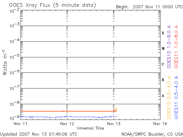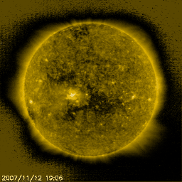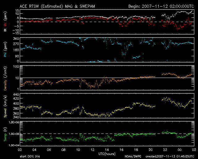 2007/11/13 10:47 更新 太陽風の磁場が強まっています。高速風の太陽風が始まるのかもしれません。 担当 篠原 SOHO EIT284の太陽写真で、コロナホールが太陽の中心に大きく見えています。 今、速度の高い太陽風が地球に向かって飛び出しているところです。 コロナホールの先端(右端)は、太陽の西側半分の位置に近づいています。 ここは、高速太陽風の先頭が地球に到達するタイミングを測る、目安の位置です。 ACE衛星によると、現在の太陽風は速度400km/秒と通常の速度です。 磁場強度も、ここまでは5nTと普通の強さだったのですが、 今朝、13日7時(世界時12日22時)頃から急に強まり始め、 現在12nTくらいに上がっています。 高速太陽風が早くも到来するのかもしれません。 27日周期の図で前周期の変化を参考にすると、 高速風の回帰は、明日、14日になりそうです。 しかし、高速風の到来が1日程度前後することは普通に見られます。 磁場強度が10nTを超えて強まっているということから、 太陽風の変化がもうやって来ているという可能性は十分あります。 今後のACEのデータに注目して下さい。 磁場が強まり、速度が上がると、 磁場が南を向くことで、一気にオーロラ活動も活発化します。 アラスカのライブカメラにも注目してみてください。 ここまでの磁気圏活動はとても静穏です。 シベリアの磁場データで小さな変化がひとつ見えている程度です。 太陽は黒点は見られず、非常に穏やかです。 X線のグラフは完全に平らになっていて、観測機が壊れているかの様です。 SOHO衛星のEIT284カメラの映像 (c) SOHO (ESA & NASA)