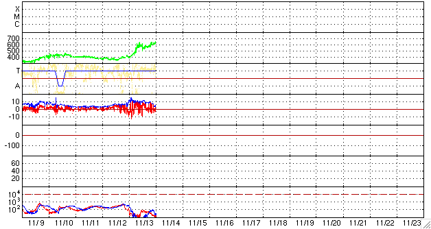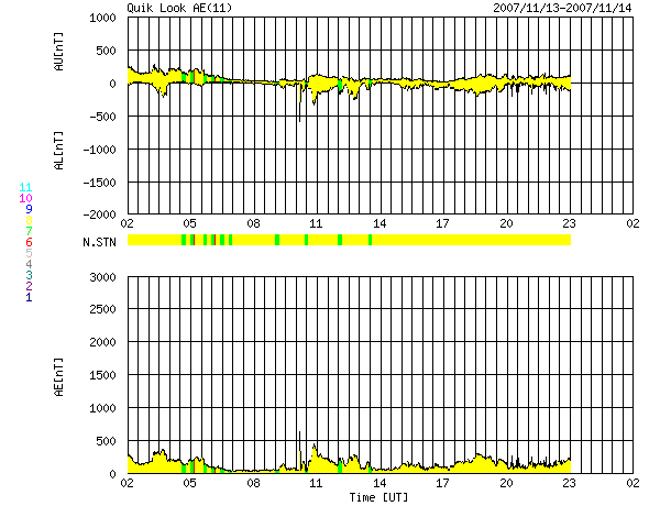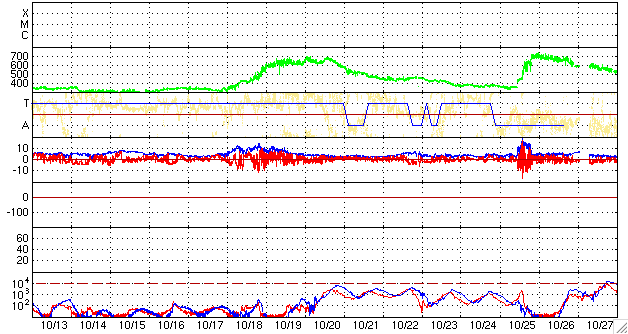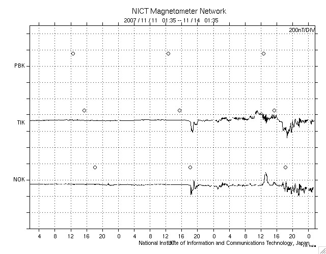 ACEが観測した太陽風の磁場(1番上の枠、白線は全体の強度、赤線は南北成分) および、太陽風の密度(3番目の橙線)、速度(4番目の黄線) (c) NOAA/SWPC ![]() リアルタイムAE指数 下段のAEグラフの値が高くなると、オーロラ活動が活発化しています。 (c) 京都大学, NICT ![]() シベリアで観測された3日間の磁場データ 右側の3分の1が、昨日のデータになります。グラフが上がったり下がったりすると、オーロラ活動が活発化しています。 (c) NICT ![]() 27日の太陽周期に合わせたデータプロット 太陽が同じ面を地球に向けていた27日前の変化から、今後を予想することができます。 (c) NICT