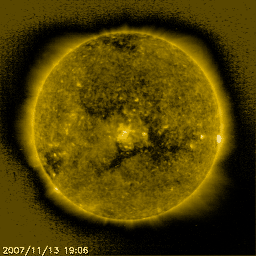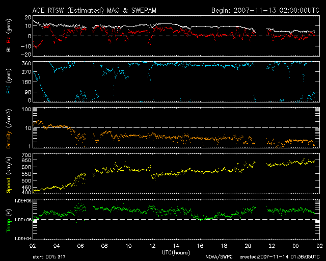 2007/11/14 10:39 更新 高速の太陽風がやって来ました。630km/秒に上昇しています。 担当 篠原 昨日のニュースの後、太陽風の速度が上昇を始めました。 数時間で一気に600km/秒に達し、その後やや速度を下げ、 再び上昇して600km/秒を超えるという変化になっています。 27日周期の図を見てください。 今周期は、1日半くらい変化が早まりました。 速度が上がった後も、磁場強度は10nTと強まったままでした。 しかし、南北成分は北寄りに推移しています。 このため、磁気圏への影響はそれほど大きくなりませんでした。 AE指数は、300nTくらいの小規模の変動にとどまっています。 それでも、1日中連続的に発生しているのは、速度がかなり高まったためでしょう。 シベリア磁場データも、変化は小刻みですが、ずっと続いています。 現在の太陽風は、速度は630km/秒に上がっていますが、 磁場強度が弱まって、5nTに落ちています。 高速風は最高速度に達したと思われます。 引き続き、現状程度の磁気圏活動が見られそうです。 SOHO EIT284の太陽写真を見てください。 太陽の中心部には、まだコロナホールが残っています。 このため、高速風はまだ4-5日くらい続きそうです。 到来は早まりましたが、終わりは前周期と同じくらいになりそうです。 2枚のSOHO EIT284写真で、前周期のコロナホールとも比較してください。 コロナが南北にちぎれて広がっているように見えます。 27日後の次の周期でも、ずいぶん違った顔になっていそうです。 太陽風の乱れを受けて、放射線帯の高エネルギー電子は大きく数を減らしています。 これから増加に転じると思います。 明日以降、変化に注目してください。 太陽は、今日も無黒点で静穏です。 SOHO衛星のEIT284カメラの映像 (c) SOHO (ESA & NASA)
