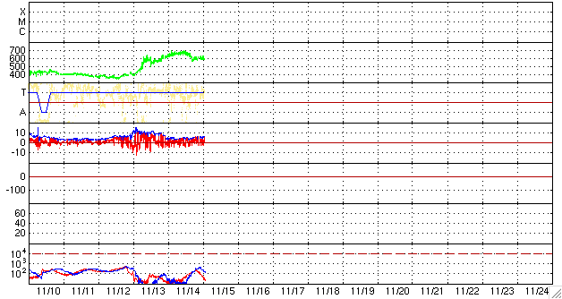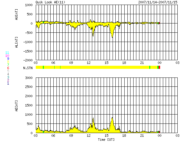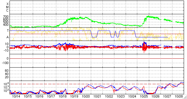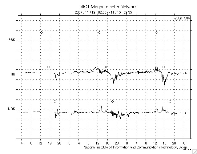 ACEが観測した太陽風の磁場(1番上の枠、白線は全体の強度、赤線は南北成分) および、太陽風の密度(3番目の橙線)、速度(4番目の黄線) (c) NOAA/SWPC ![]() リアルタイムAE指数 下段のAEグラフの値が高くなると、オーロラ活動が活発化しています。 (c) 京都大学, NICT ![]() シベリアで観測された3日間の磁場データ 右側の3分の1が、昨日のデータになります。グラフが上がったり下がったりすると、オーロラ活動が活発化しています。 (c) NICT ![]() 27日の太陽周期に合わせたデータプロット 太陽が同じ面を地球に向けていた27日前の変化から、今後を予想することができます。 (c) NICT