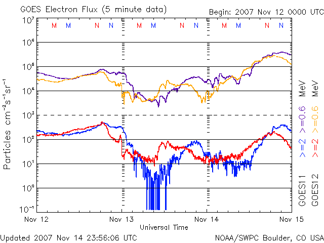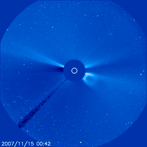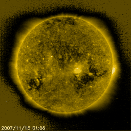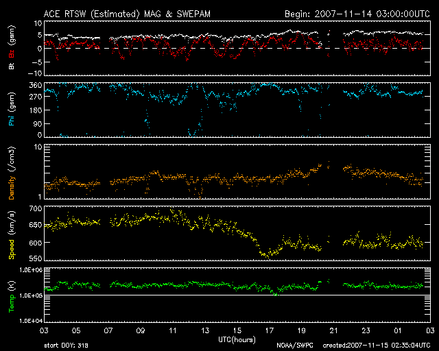 2007/11/15 11:36 更新 600km/秒台の高速太陽風が続いています。一時的にオーロラが活発化しています。 担当 篠原 SOHO LASCO C3カメラで、太陽の西側から飛び出すCME(太陽ガスの放出現象)が見えていました。 ちょうど飛び出したところで、まだ出かかっている写真があるだけです。 なかなかきれいな形をしているので、今日は大きな写真を掲載します。 CMEは西の端で起きているので、地球への影響はありません。 600km/秒台の高速の太陽風が続いています。 昨日のニュースの後、太陽風の速度は650km/秒に達しました。 その後、14日いっぱい(世界時では14日15時頃まで)この速度が続き、 以降、600km/秒ちょうどに下がっています。 一方、磁場強度は5nTと通常のレベルを保っています。 このため、地球は今、高速太陽風領域の中盤を通過していると考えられます。 速度が下がり始めるのは、磁場強度が3nTくらいに下がった頃からです。 磁気圏のオーロラ活動は、速度が高い割にそれほど活発ではありません。 太陽風磁場の南北成分(ACEの図の赤線)が、北寄りに(プラス)なっているためです。 ところどころで一時的に南を向き(マイナス)、 その影響で短時間の活発なオーロラ活動が発生しています。 AE指数では、800nTの中規模変動が2回記録されています。 その他の時間帯は概ね静穏です。 今後も、太陽風磁場が北寄りであれば、今の状態が続きます。 南寄りに切り替わると、磁気圏はより活動的に変わるでしょう。 SOHO EIT284の太陽コロナ写真では、 現在の高速風をもたらしているコロナホールは、太陽の中心を通り過ぎた様です。 高速太陽風は、次第に後半部へと入って行くでしょう。 また、太陽の東端(左端)には、次のコロナホールが見えて来ました。 こちらの高速風は、11月21日頃に回帰して来ると予想されます。 放射線帯の高エネルギー電子は、今のところ大きく増加していません。 もうしばらく変化に注目してください。 太陽はたいへん静穏です。 無黒点が続いています。 太陽の西側から飛び出すCME(太陽ガスの放出現象)。SOHO LASCO C3カメラ。 (c) ESA & NASA ![]() SOHO衛星のEIT284カメラの映像 (c) SOHO (ESA & NASA)