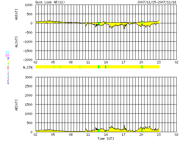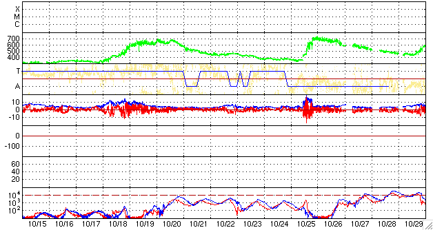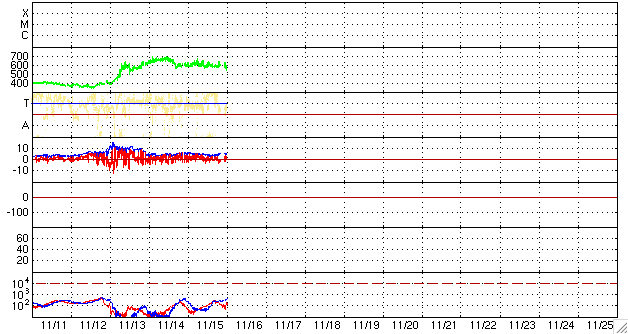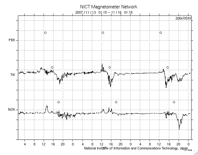 ACEが観測した太陽風の磁場(1番上の枠、白線は全体の強度、赤線は南北成分) および、太陽風の密度(3番目の橙線)、速度(4番目の黄線) (c) NOAA/SWPC ![]() リアルタイムAE指数 下段のAEグラフの値が高くなると、オーロラ活動が活発化しています。 (c) 京都大学, NICT ![]() シベリアで観測された3日間の磁場データ 右側の3分の1が、昨日のデータになります。グラフが上がったり下がったりすると、オーロラ活動が活発化しています。 (c) NICT ![]() 27日の太陽周期に合わせたデータプロット 太陽が同じ面を地球に向けていた27日前の変化から、今後を予想することができます。 (c) NICT