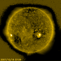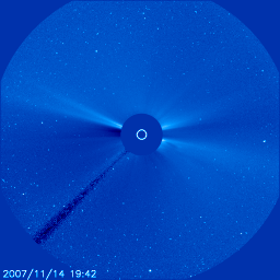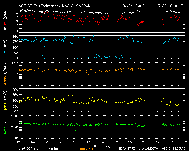 2007/11/16 10:19 更新 600km/秒の高速太陽風が続いています。磁気圏活動は小規模です。 担当 篠原 昨日紹介したCMEの続きを、動画にして掲載します。 太陽の西側から比較的ゆっくりとした速度で、コロナのガスが飛び出しています。 煙のリングがゆっくりと宇宙空間に広がっていきます。 太陽(写真中央の白丸)の10倍には広がっていますから、 地球の1000倍の大きさの巨大リングです。 速度の高い太陽風が続いています。 昨日以降も、600km/秒台のかなり高い速度で安定した状態が続いています。 磁場強度も5nTで安定していて、こちらも下がらずに通常レベルを保っています。 今朝になって、速度が550km/秒近くに下がっていますが、 磁場強度がまだ落ちていないので、 まだ簡単には速度低下には向かわないのではないかと思います。 もうしばらく600〜550km/秒くらいの速度を保つのではないでしょうか。 27日周期の図を見て下さい。 前周期は、10月20日までかなり高い速度を保ち、21日から下がり始めています。 このパターンを踏襲すると、速度の低下は明日に入ってからと考えられます。 SOHO EIT284の太陽写真は、最新(左)と27日前(右)を掲載しています。 左の写真を見ると、太陽の中央部やや北寄り(上寄り)は、 淡めのコロナホールになっているようです。 前周期の写真では、その姿は見えていません。 もし、コロナホール的な構造ができてきたと考えると、 高速太陽風はやや速度を下げながらも、更に4日近く続く可能性もあります。 また、東端(左端)から上がって来たコロナホールも次第に良く見えるようになってきました。 位置的には前周期のコロナホールとほとんど同じです。 ただ、規模は縮小しているようです。 27日周期の図で考えると、このコロナホールの影響は、 11月21〜22日くらいにやって来ると思われます。 前回は最高速度が700km/秒に達していましたが、今回はいくらか弱まるのかもしれません。 かなり速度の高い太陽風が続いていますが、磁気圏は比較的穏やかです。 AE指数では、300nTくらいの小規模の変動が見られるだけです。 これは、太陽風磁場の南北成分が、北寄りの傾向を保っているためです。 この傾向が続く限り、今後も磁気圏は比較的穏やかな状態を保つでしょう。 放射線帯の高エネルギー電子は、ほとんど変化をしていません。 高速風は続いていますので、引き続き注意をしてください。 太陽は無黒点で、とても穏やかです。 SOHO LASCO C3カメラによる、11月15日のCME(太陽ガスの放出現象)。太陽から西に向かって飛び出しています。 (c) ESA & NASA ![]() SOHO衛星のEIT284カメラの映像 (c) SOHO (ESA & NASA)