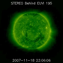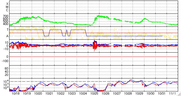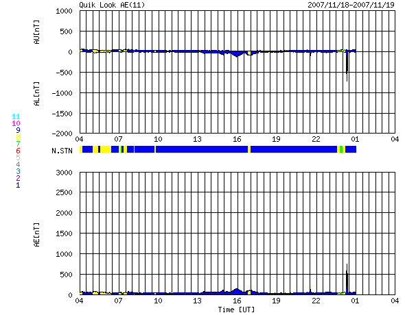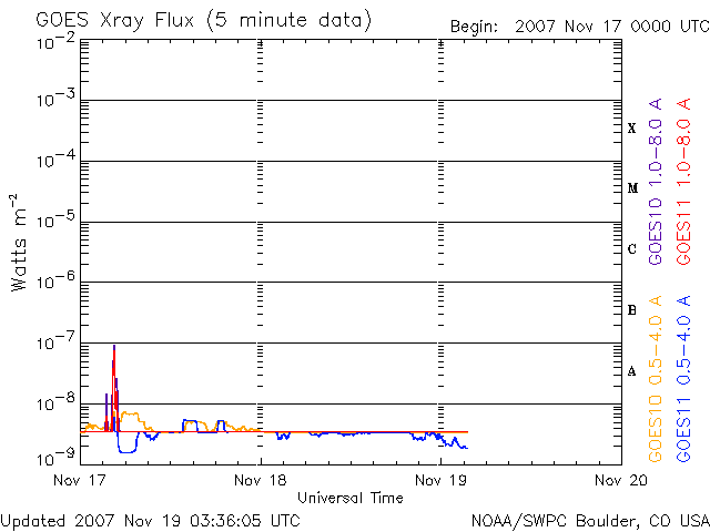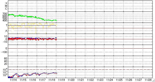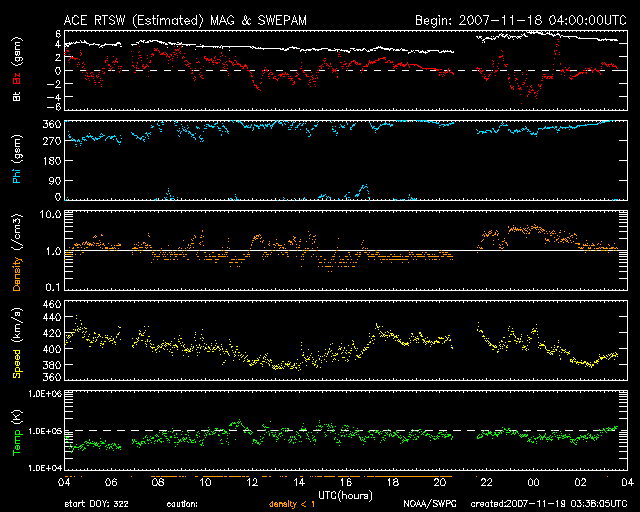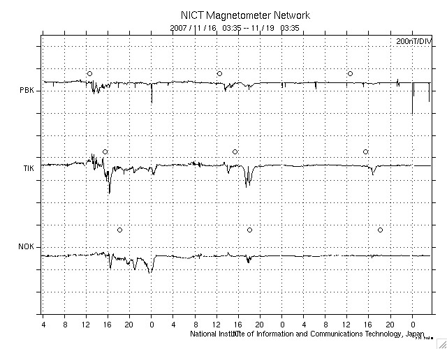 2007/11/19 12:39 更新 通常の速度で安定した太陽風が続いています。磁気圏はとても静かです。 担当 篠原 400km/秒と、通常の速度で安定した太陽風が続いています。 磁場強度も、4nTと普通の強さのままです。 磁気圏もとても穏やかで、 AE指数、シベリア磁場データとも全く変化がありません 高速風から抜けた後も、速度が下がりきって低速風にならないという変化は、 27日前の前周期の様子と似ています。 太陽風は、現在の安定した状態を明日くらいまで保ちそうです。 磁気圏も同様に静穏なままでしょう。 今日は、STEREOの太陽コロナ写真を掲載しています。 地球と衛星の位置関係から、1日先の太陽の様子を見ていることになります。 太陽の南半球側に、大きくカーブを描いてコロナホールが伸びています。 ここの影響が、21日か22日にやって来るでしょう。 そこから、再び高速の太陽風が始まります。 27周期の図で10月25日から30日にかけての変化の回帰です。 太陽は無黒点のままです。 太陽写真には、黒点群の番号だけが残っています。 X線のグラフは非常に静かです。 STEREO衛星紫外線望遠鏡EUVI195の太陽写真。19日7時(世界時18日22時) (c) NASA ![]() ACEが観測した太陽風の磁場(1番上の枠、白線は全体の強度、赤線は南北成分) および、太陽風の密度(3番目の橙線)、速度(4番目の黄線) (c) NOAA/SWPC ![]() リアルタイムAE指数 下段のAEグラフの値が高くなると、オーロラ活動が活発化しています。 (c) 京都大学, NICT ![]() シベリアで観測された3日間の磁場データ 右側の3分の1が、昨日のデータになります。グラフが上がったり下がったりすると、オーロラ活動が活発化しています。 (c) NICT ![]() 27日の太陽周期に合わせたデータプロット 太陽が同じ面を地球に向けていた27日前の変化から、今後を予想することができます。 (c) NICT