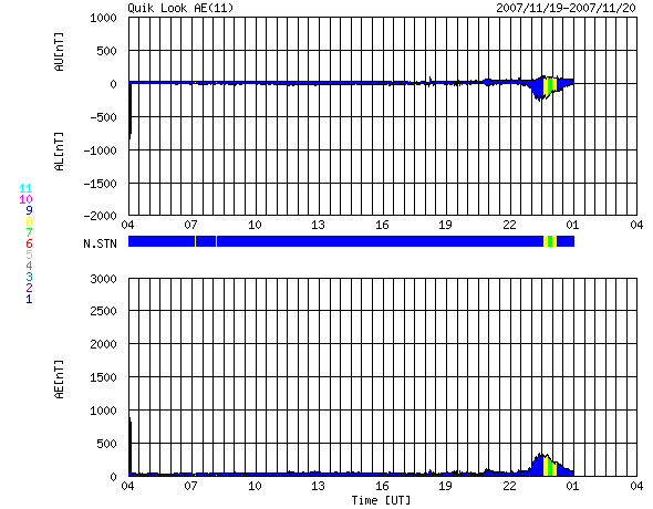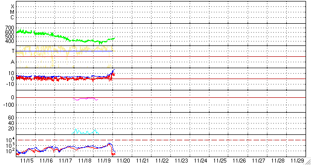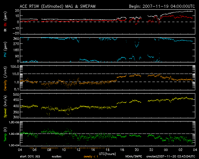 2007/11/20 12:44 更新 太陽風の磁場強度が大きく強まっています。この後、磁気圏が活動的になるかもしれません。 担当 篠原 太陽風が急に乱れ始めました。 20日2時(世界時19日17時)から、磁場強度、速度、密度が上昇を始めたのです。 磁場強度はぐんぐん上がり続け、現在、18nTに達しています。 もう少し上昇するかもしれません。 速度も上昇していますが、変化は小幅で、450km/秒に達した程度です。 密度は8個/cm^3に上がり、現在は2個/cm^3に下がっています。 コロナホールからの高速太陽風が早くやって来たというよりも、 太陽から何かが飛び出して、流れて来た様に感じられる変化です。 15-16日に太陽の西側に見られたCME(太陽ガスの放出現象)の影響が、 地球側まで届いたのでしょうか。 引き続き太陽風の変化に注目してください。 速度が本格的に上がり始める様でしたら、コロナホールの高速風の到来です。 速度はこのまま変わらず、やがて磁場強度が下がって行くという変化であれば、 CMEの影響と考えるべきかもしれません。 磁場強度が大きく強まっていますが、 太陽風磁場の南北成分は北向きが続いています。 このため、磁気圏への目立った影響は見られません。 AE指数で300nTの変化がひとつある程度です。 しかし、今後南北成分がくるっと反転する可能性があります。 その場合、磁場強度が大きいので、南向きも大きくなると予想されます。 速度がたいしたレベルではありませんが、 それでも活発な磁気圏活動を引き起こすと考えられます。 この点でも、今後の太陽風に注目してください。 南向きが強まれば、オーロラも活発化する可能性があります。 アラスカのライブカメラにも注目してください。 現在の変化との対応はまだ不明確ですが、 いずれにせよ、明日、明後日にはコロナホールの影響がやってくるでしょう。 STEREOの写真では、コロナホールは太陽の西側にだいぶ移動しています。 太陽風の乱れの影響で、放射線帯の高エネルギー電子は大きく数を減らしています。 太陽はとても穏やかです。 黒点は見られません。 STEREO衛星紫外線望遠鏡EUVI195の太陽写真。20日7時(世界時19日22時) (c) NASA ![]() ACEが観測した太陽風の磁場(1番上の枠、白線は全体の強度、赤線は南北成分) および、太陽風の密度(3番目の橙線)、速度(4番目の黄線) (c) NOAA/SWPC ![]() リアルタイムAE指数 下段のAEグラフの値が高くなると、オーロラ活動が活発化しています。 (c) 京都大学, NICT ![]() シベリアで観測された3日間の磁場データ 右側の3分の1が、昨日のデータになります。グラフが上がったり下がったりすると、オーロラ活動が活発化しています。 (c) NICT ![]() 27日の太陽周期に合わせたデータプロット 太陽が同じ面を地球に向けていた27日前の変化から、今後を予想することができます。 (c) NICT