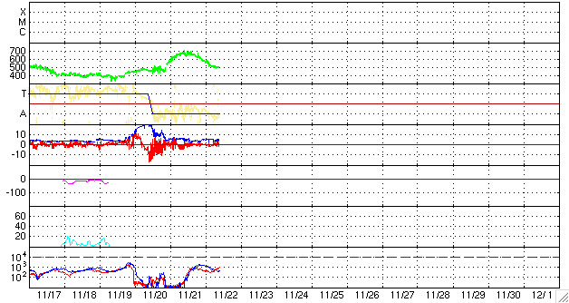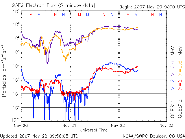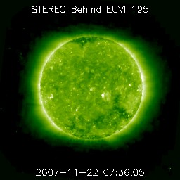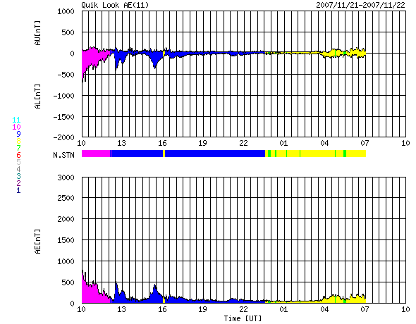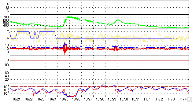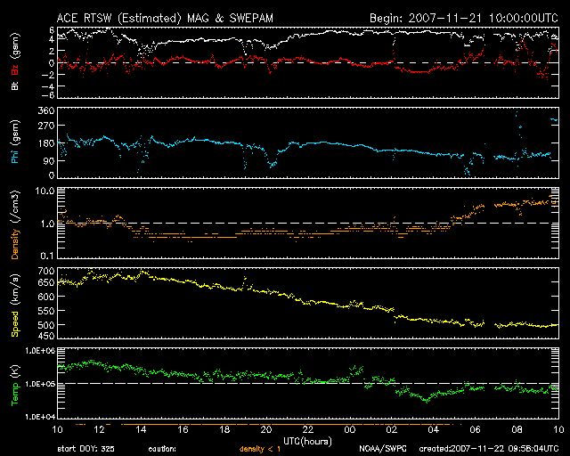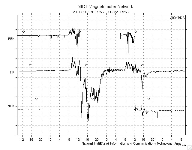 2007/11/22 18:59 更新 太陽風速度は、700km/秒に上がり、500km/秒に下がりました。高速風が続いています。 担当 篠原 昨日より、茨城県柿岡の地磁気観測所へ来ていました。 ここは気象庁が運営する、日本を代表する地磁気の観測所です。 こちらで、観測に使用する磁力計の校正試験を行っていました。 更新が遅くなり申し訳ありません。 昨日から始まった、高速の太陽風は、 昨夜のうちに700km/秒近くまで速度が上昇し、最高速度を迎えました。 今日に入ってから(22日0時、世界時21日15時以降)は低下に向かい、 既に500km/秒まで下がっています。 普通の高速風という程度の速度です。 27日周期の図より、前周期の変化と比較すると、 前周期は500km/秒以上が2日半くらい続いていました。 それと比べると、速度の下がり方はだいぶ早くなっています。 ただ、コロナホールの様子から考えると、このまま速度が下がってしまうというより、 500km/秒程度の風がもう数日続きそうに思われます。 そのあたりも、今後の変化に注目してみてください。 昨日の激しい活動の後、磁気圏はだいぶ落ち着いています。 昨夜いっぱいは、速度も高く、中規模のオーロラ活動が続いていましたが、 速度が下がって来た今日は、磁気圏はだいぶ穏やかになっています。 これは、太陽風磁場の南北成分が、 ほとんど0nT付近にあるということも影響しています。 まだ、太陽風の速度は高いですから、 引き続き中・小規模のオーロラ活動が期待できるでしょう。 放射線帯の高エネルギー電子は、やや増えた状態になっています。 引き続き増え続ける可能性が高いので、明日以降も注目してください。 太陽は無黒点のままです。 STEREO衛星紫外線望遠鏡EUVI195の太陽写真。22日16時半(世界時22日7時半) (c) NASA ![]() ACEが観測した太陽風の磁場(1番上の枠、白線は全体の強度、赤線は南北成分) および、太陽風の密度(3番目の橙線)、速度(4番目の黄線) (c) NOAA/SWPC ![]() リアルタイムAE指数 下段のAEグラフの値が高くなると、オーロラ活動が活発化しています。 (c) 京都大学, NICT ![]() シベリアで観測された3日間の磁場データ 右側の3分の1が、昨日のデータになります。グラフが上がったり下がったりすると、オーロラ活動が活発化しています。 (c) NICT ![]() 27日の太陽周期に合わせたデータプロット 太陽が同じ面を地球に向けていた27日前の変化から、今後を予想することができます。 (c) NICT