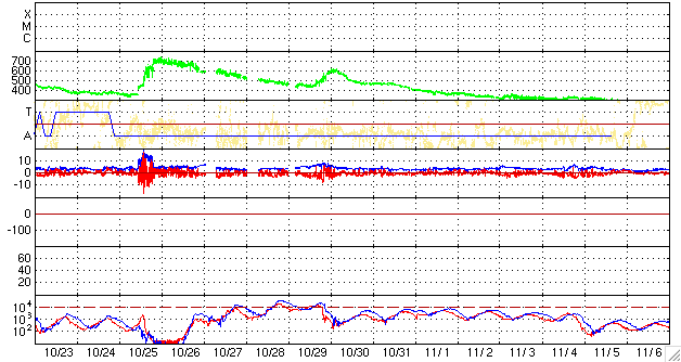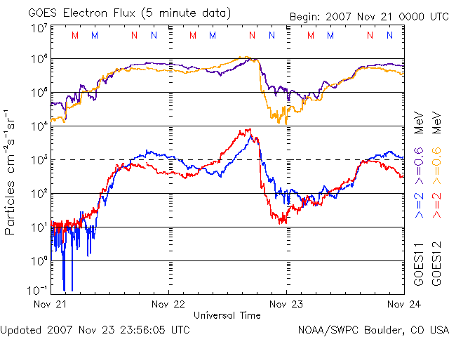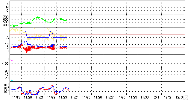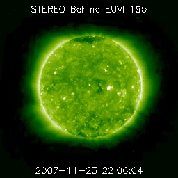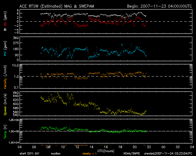 2007/11/24 12:24 更新 太陽風は高速状態が続いています(550km/秒)。これからゆっくりと下がって行くでしょう。 担当 篠原 高速太陽風のふたつめの山も、ピークを越えて速度が下がり始めています。 昨日600km/秒に上がっていた太陽風の速度は、 24日に入った頃、550km/秒に下がりました。 状態としては、高速の太陽風がまだ続いています。 速度が高かった間は、磁気圏もやや活動的でした。 AE指数(今日は掲載していません)では、 500nTくらいの小さめの中規模活動が連続的に見られています。 24日に入って、速度が下がり始めると、磁気圏への影響も弱まり、 AE指数は比較的穏やかになっています。 これから明日にかけて、太陽風はゆっくりと速度を下げて行くでしょう。 前周期では、もう一度小さな速度の山が来ていましたが、 今周期はどうなるでしょうか。 やって来るとすると、11月26日頃の変化です。 その後は、太陽風の速度が下がり、 とても穏やかな状態が2週間くらい続きます。 放射線帯の高エネルギー電子は、1000とやや高めの程度で、 大きな増加にはなっていません。 明日にかけてもう少し上昇すると思われるので、引き続き注目してださい。 ただ、警戒レベルまでの増加にはならないように思われます。 太陽は無黒点で、とても穏やかです。 何も見えない太陽が続きます。 STEREO衛星紫外線望遠鏡EUVI195の太陽写真。24日7時(世界時23日22時) (c) NASA ![]() ACEが観測した太陽風の磁場(1番上の枠、白線は全体の強度、赤線は南北成分) および、太陽風の密度(3番目の橙線)、速度(4番目の黄線) (c) NOAA/SWPC ![]() シベリアで観測された3日間の磁場データ 右側の3分の1が、昨日のデータになります。グラフが上がったり下がったりすると、オーロラ活動が活発化しています。 (c) NICT ![]() 27日の太陽周期に合わせたデータプロット 太陽が同じ面を地球に向けていた27日前の変化から、今後を予想することができます。 (c) NICT