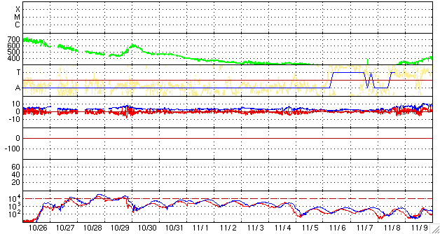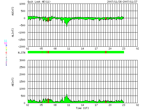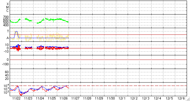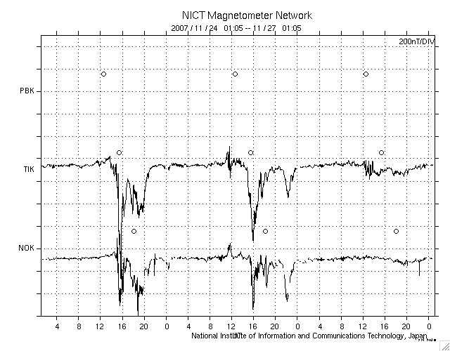ACEが観測した太陽風の磁場(1番上の枠、白線は全体の強度、赤線は南北成分) および、太陽風の密度(3番目の橙線)、速度(4番目の黄線) (c) NOAA/SWPC ![]() リアルタイムAE指数 下段のAEグラフの値が高くなると、オーロラ活動が活発化しています。 (c) 京都大学, NICT ![]() シベリアで観測された3日間の磁場データ 右側の3分の1が、昨日のデータになります。グラフが上がったり下がったりすると、オーロラ活動が活発化しています。 (c) NICT ![]() 27日の太陽周期に合わせたデータプロット 太陽が同じ面を地球に向けていた27日前の変化から、今後を予想することができます。 (c) NICT