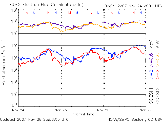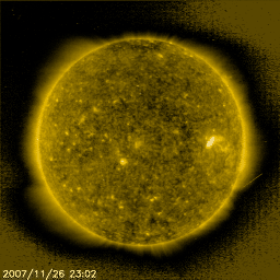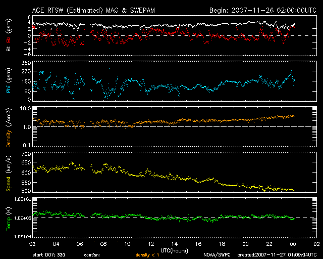 2007/11/27 10:06 更新 高速太陽風は終盤を迎えています。速度は500km/秒で、低下が続いています。 担当 篠原 昨日の夕方、26日18時(世界時26日9時)頃から、太陽風の速度の低下が始まりました。 600km/秒からゆっくりと下がって行き、半日ほどで500km/秒に落ちています。 この後も低下を続け、明日には普通の速度に戻っているのではないでしょうか。 太陽風の磁場強度も3nTに弱まっており、高速風の終盤らいし強度になっています。 速度が下がり始めたことと、磁場強度が弱まって来たため、 磁気圏のオーロラ活動も規模が小さくなっています。 AE指数では、500nTの変化がひとつ見えるだけで、あとは小さな変化だけです。 今後は一段と穏やかになっていくでしょう。 シベリア磁場データでも、3日前、2日前と活発な変化が記録されましたが、 昨日になって、小幅の変化に収まっています。 これから、長い静穏期間の始まりです。 27日周期の図を見てください。 前周期のグラフでは、図の右端までずっと静かな太陽風が続いています。 11月9日に小さな盛り上がりが見えますが、 ここは、450km/秒まで小さく速度が上がっただけです。 この領域の今周期の様子が楽しみですが、 本格的な高速風は更にその先、11月13日からでした。 11月9日は、今周期の12月6日。 11月13日は、12月10日に相当します。 ひとまず、これから10日間ほどは穏やかに過ぎて行くでしょう。 SOHO EIT284の太陽写真ものっぺりとしていて、コロナホールは見られません。 放射線帯高エネルギー電子は、ぎりぎりで警戒レベルの10000に達しています。 明日にかけて、もう少し上がるだろうと思いますが、 大きく上昇することはないでしょう。 衛星の運用では、しばらくの間注意が必要です。 太陽黒点は975群がかろうじて残っているようです。 掲載しているSOHOの写真では判別がつきません。 SOHO EIT284で、太陽の西側(左側)に明るく光っている領域です。 太陽はとても穏やかです。 SOHO衛星のEIT284カメラの映像 (c) SOHO (ESA & NASA)