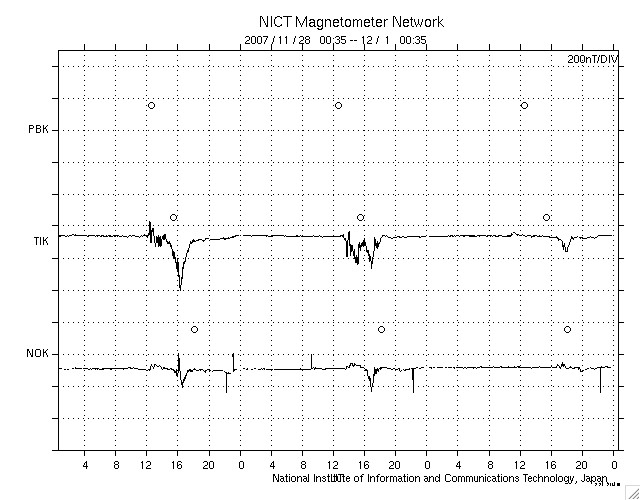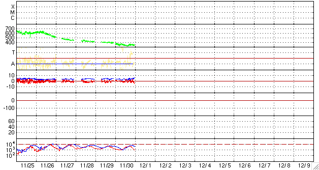 - 2007/11/30 10:23 太陽風は次第に低速風に移行しています。磁気圏は概ね静穏です。