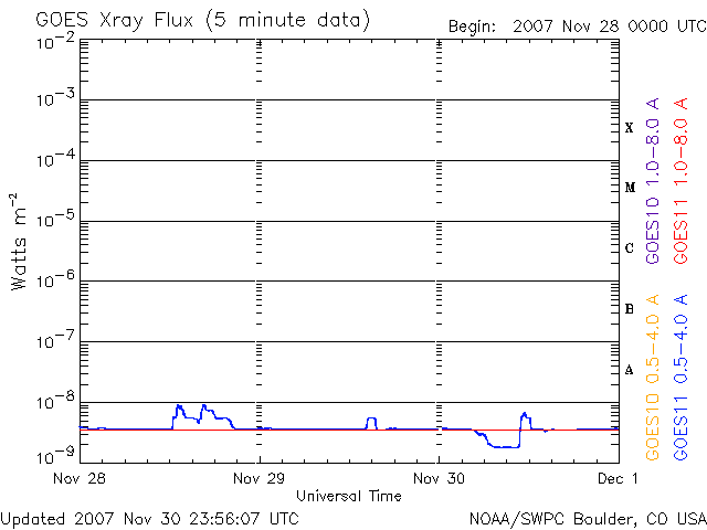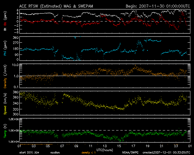 - 2007/11/28 10:23 太陽風は通常の速度に戻りつつあります。これから穏やかな期間が続きます。