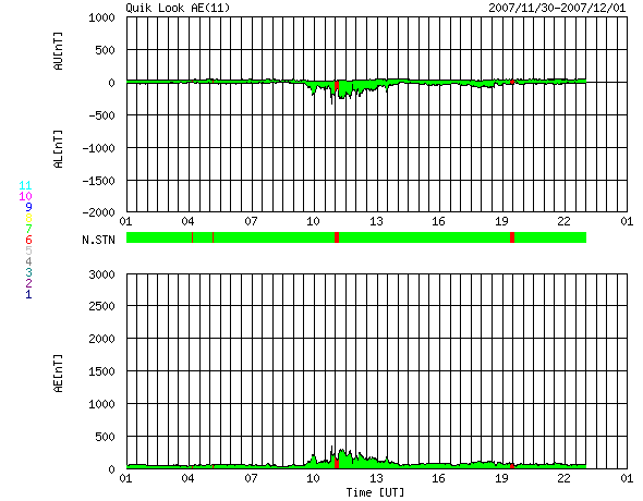 AE指数では250nTの小規模の変化がひとつ見られるだけで、
